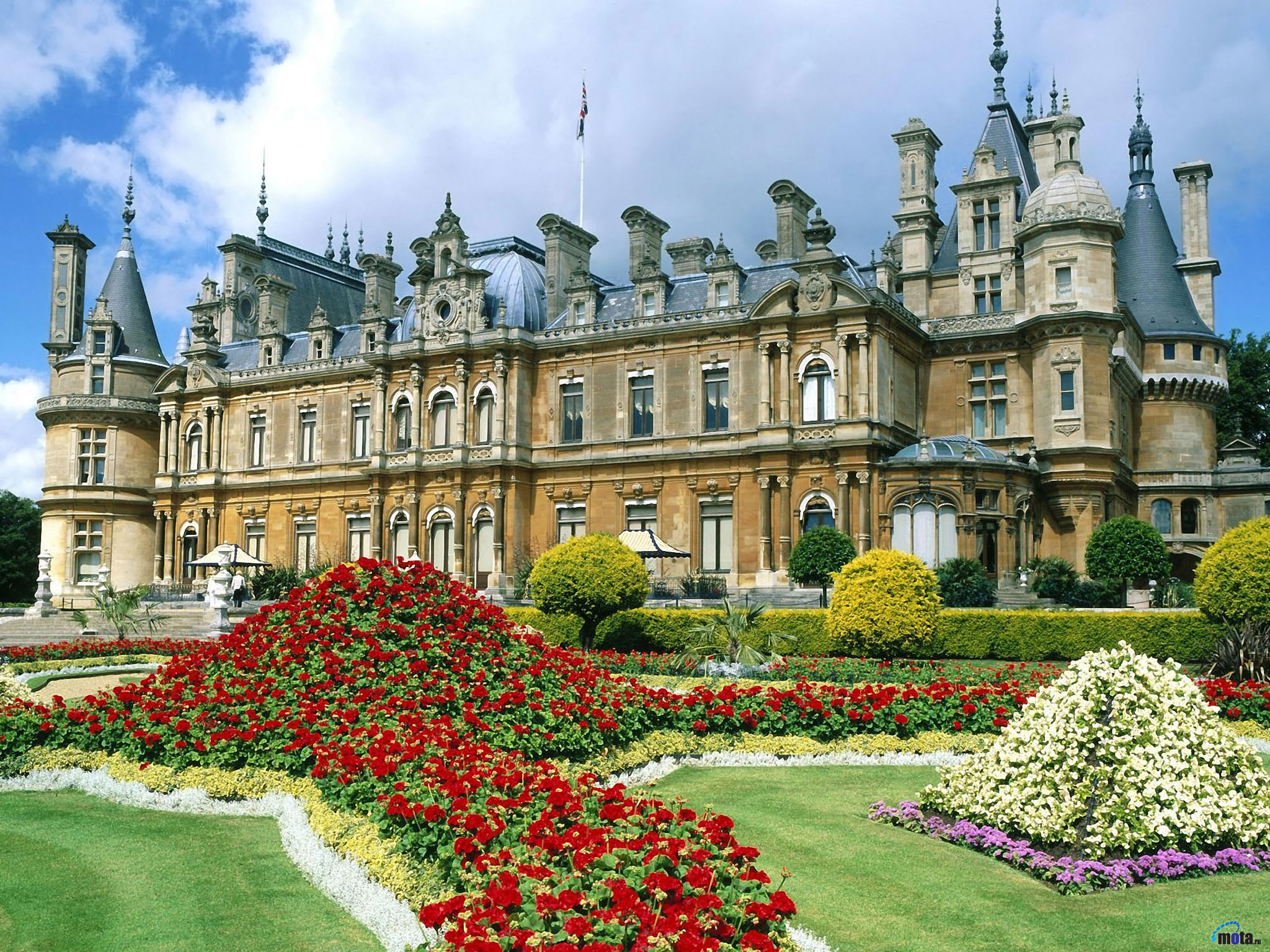 Description: A large building with a garden in front of it and a lot of flowers in the front of it.
