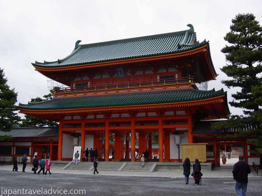 Description: A large building with a green roof and a red roof and a lot of people walking around it and trees.