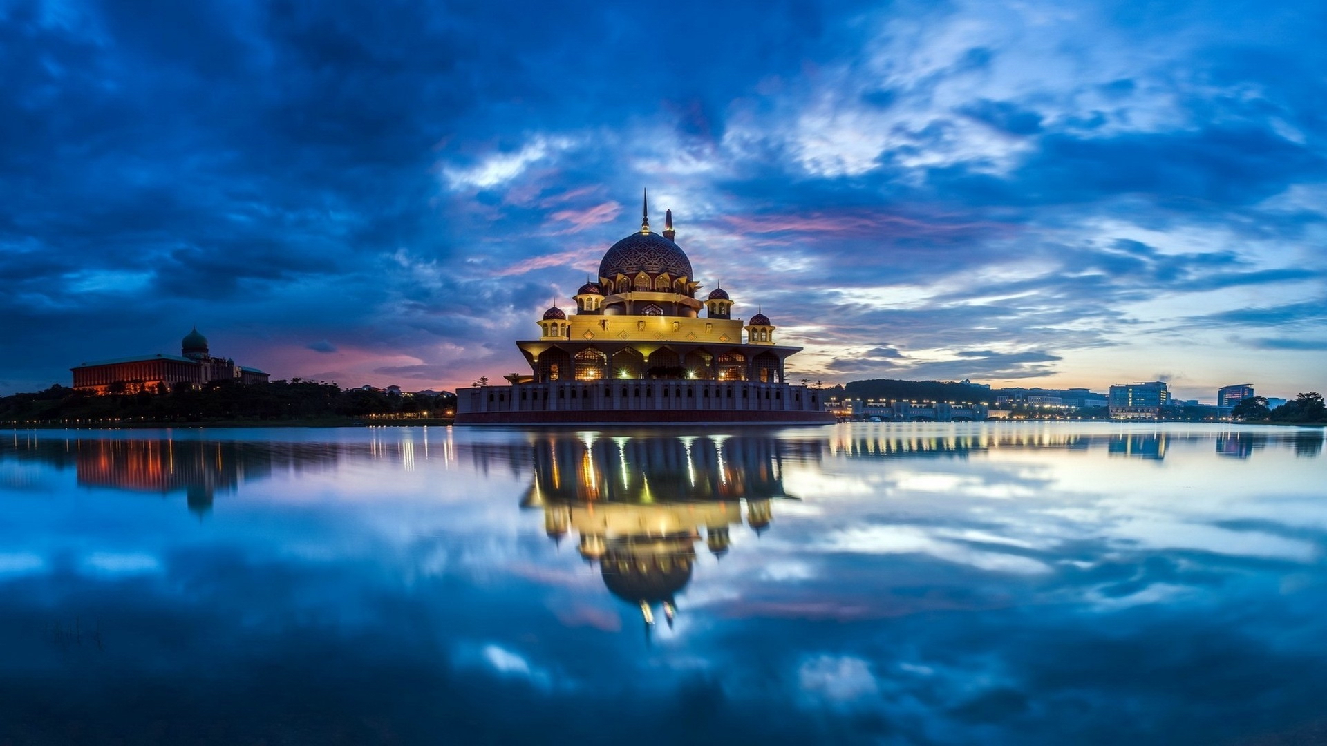 Description: A large building sitting on top of a lake under a cloudy sky with a clock tower in the middle.