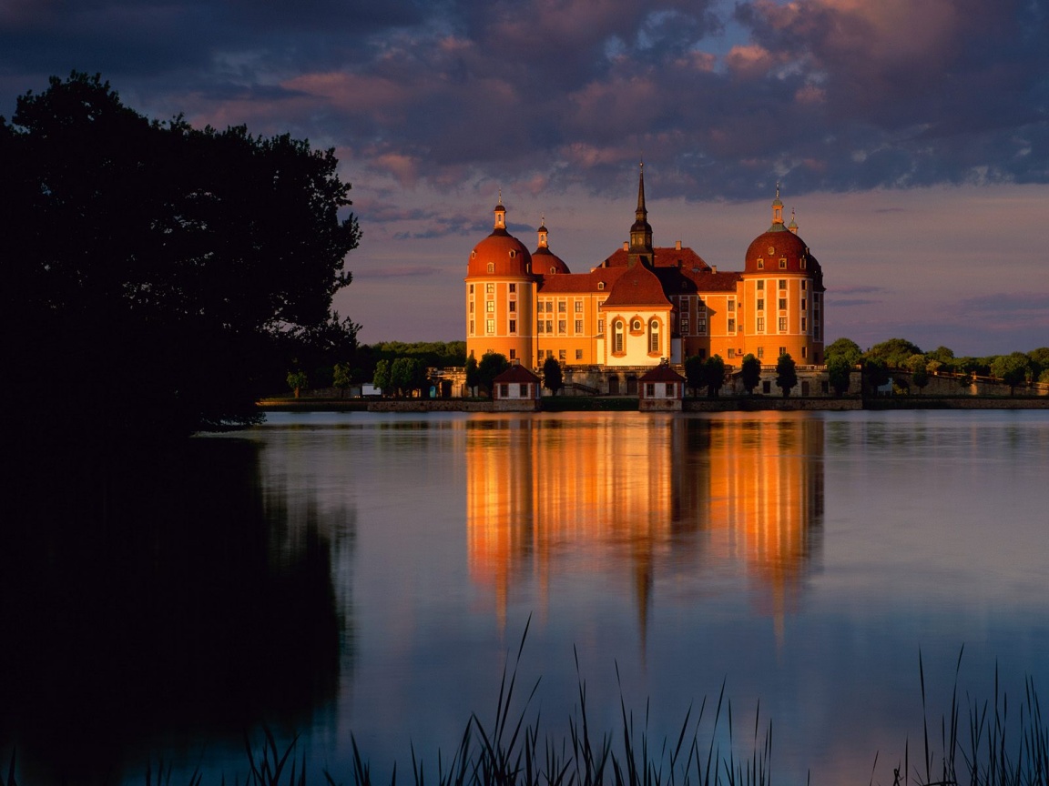 Description: A large building sitting on top of a lake next to a forest filled with trees and grass at night.