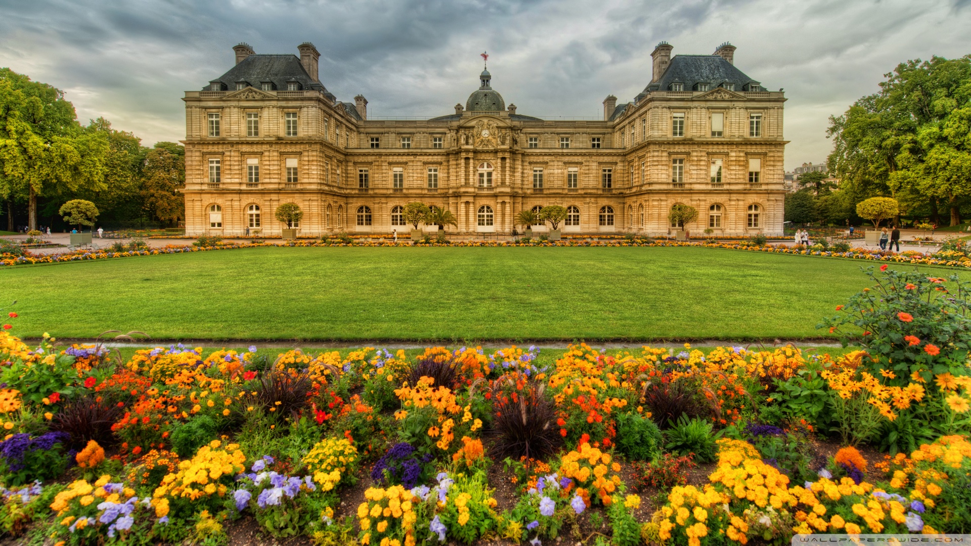 Description: A large building with a lawn and flowers in front of it and a cloudy sky above it and a field of flowers in front of it.