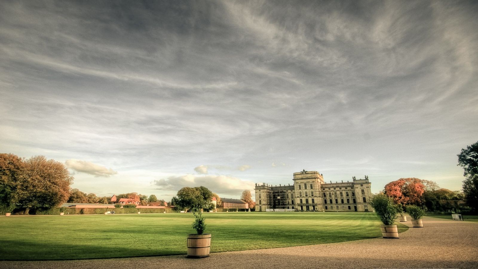 Description: A large building with a large lawn in front of it and trees in the background with clouds in the sky.