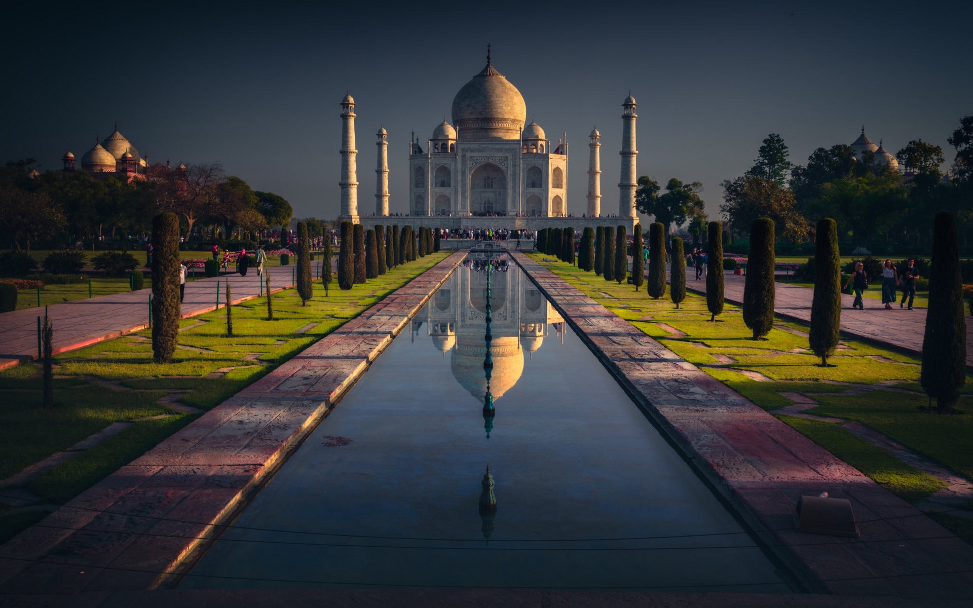 Description: A large building with a long pool of water in front of it at night time with a reflection of the building.