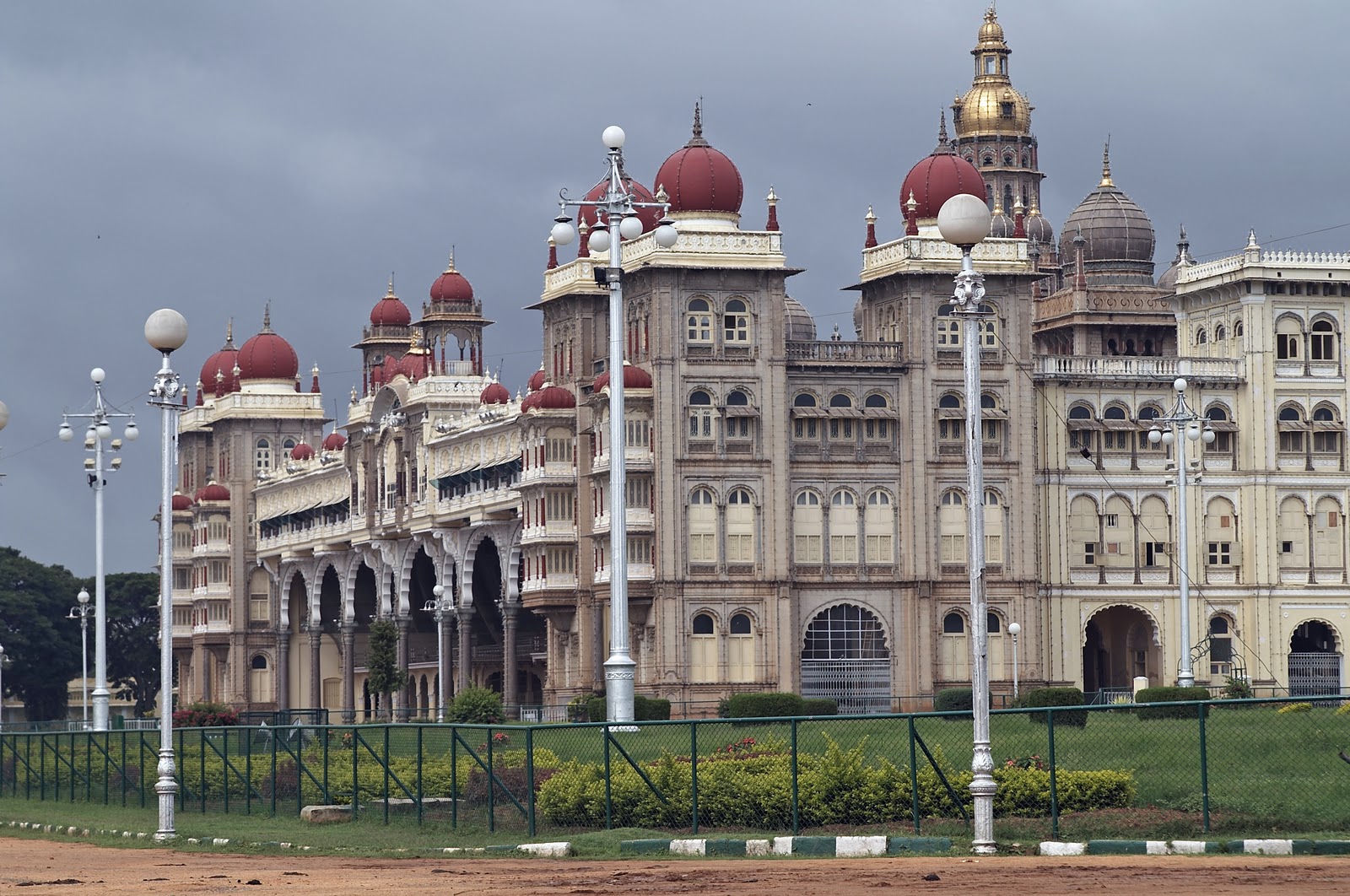 Description: A large building with red domes and a green fence in front of it and a green fence around it.