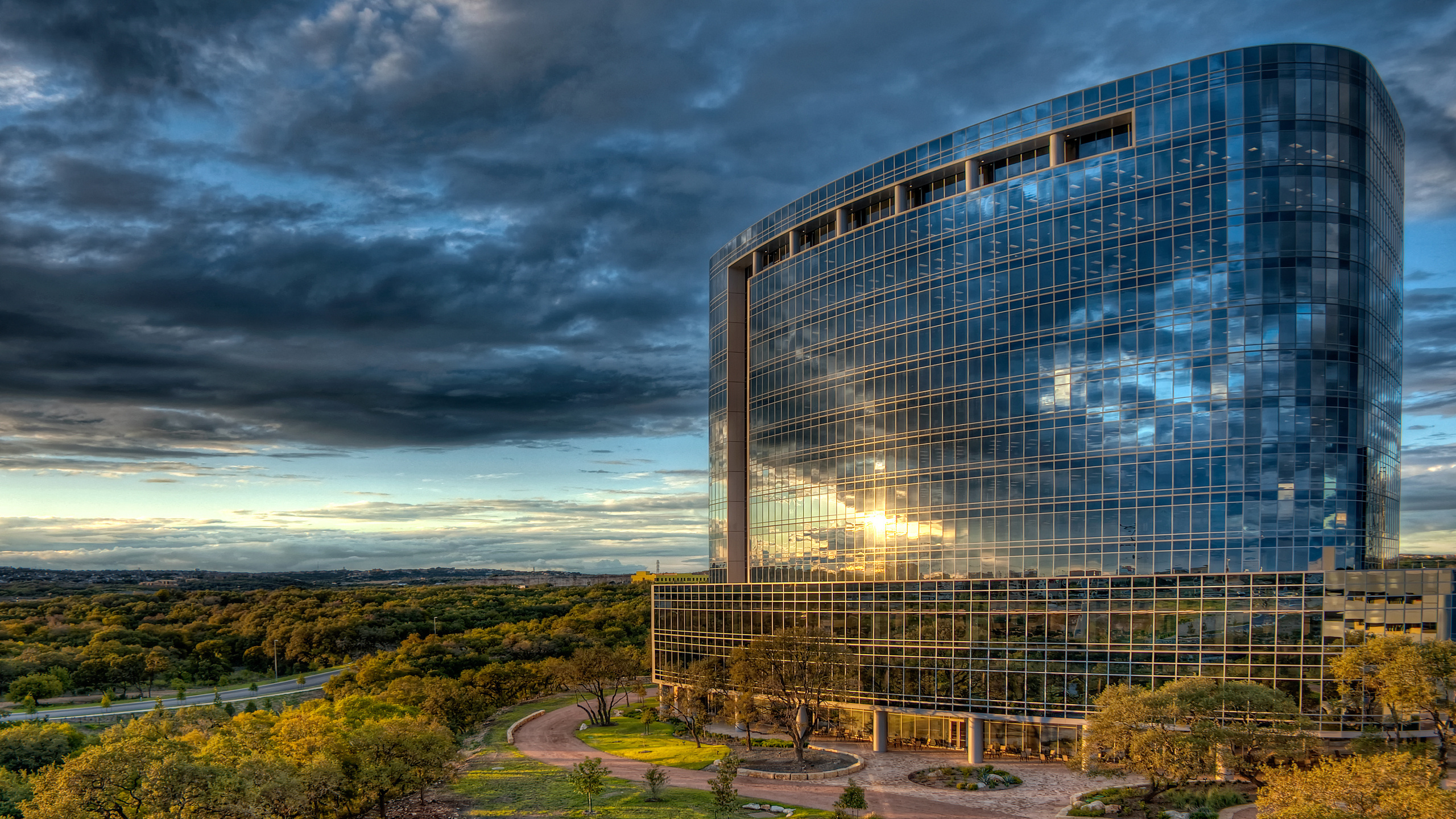 Description: A large building with a sky background and trees in the foreground and a road in the foreground.