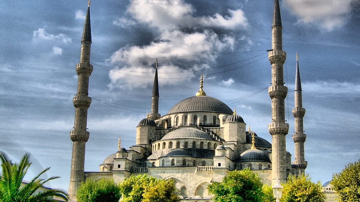 Description: A large building with a lot of spires and a clock on it's side and a cloudy sky.
