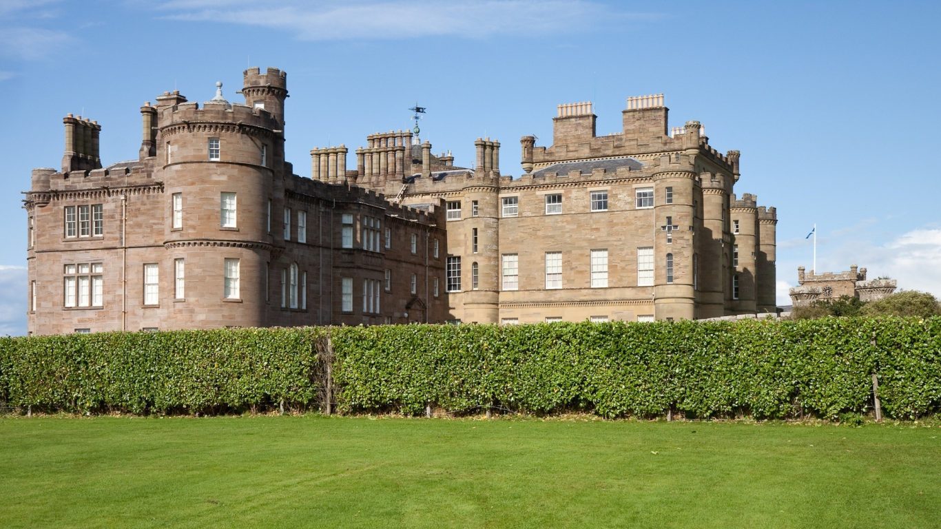 Description: A large building with a tall hedge in front of it on a sunny day with a blue sky in the background.