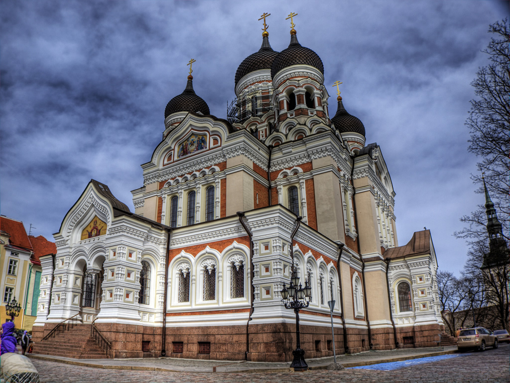 Description: A large building with a tower and a clock on it's side and a cloudy sky in the background.