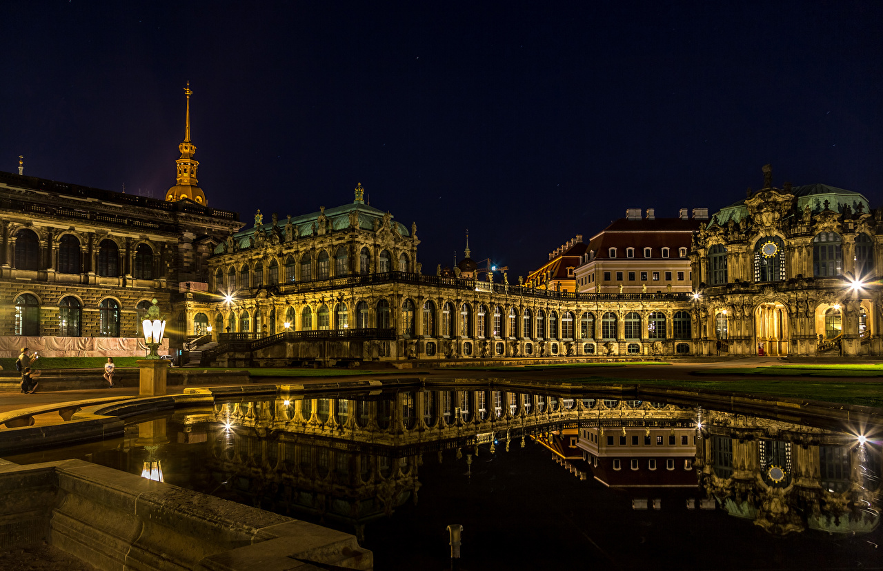 Description: A large building with a tower and a clock tower at night time with a pond in front of it.