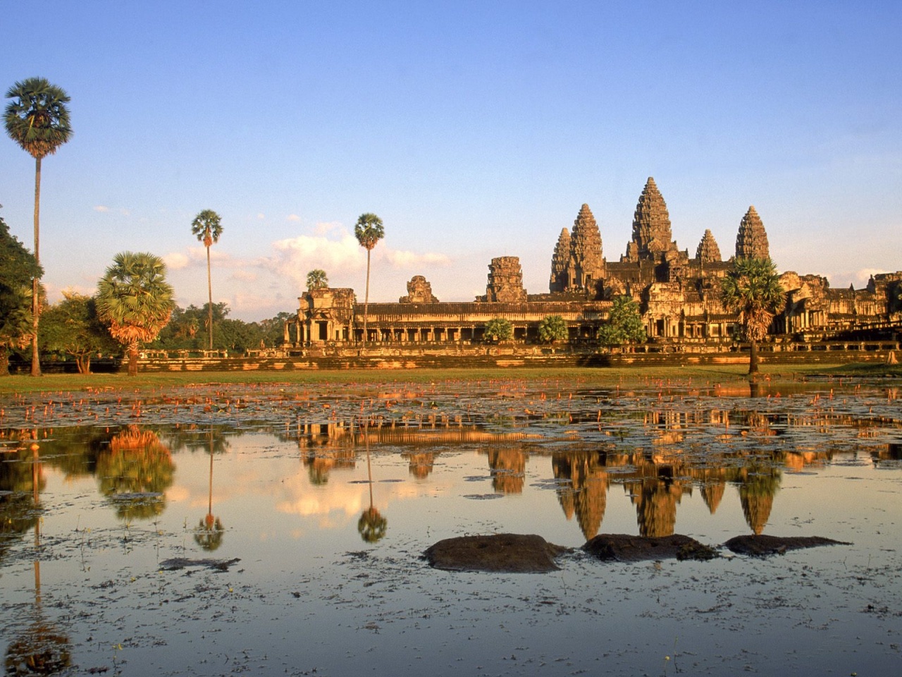 Description: A large building with a lot of trees in the background and water in the foreground with a few trees in the foreground.