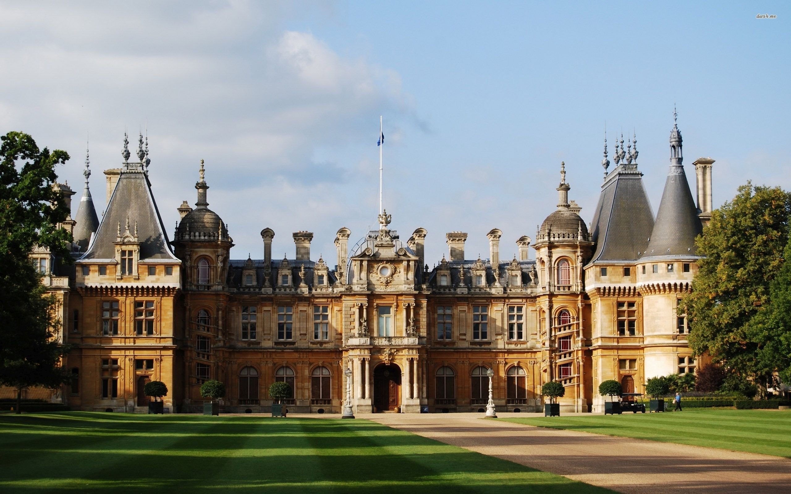 Description: A large building with a lot of windows and a flagpole on top of it's roof and a lawn in front of it.