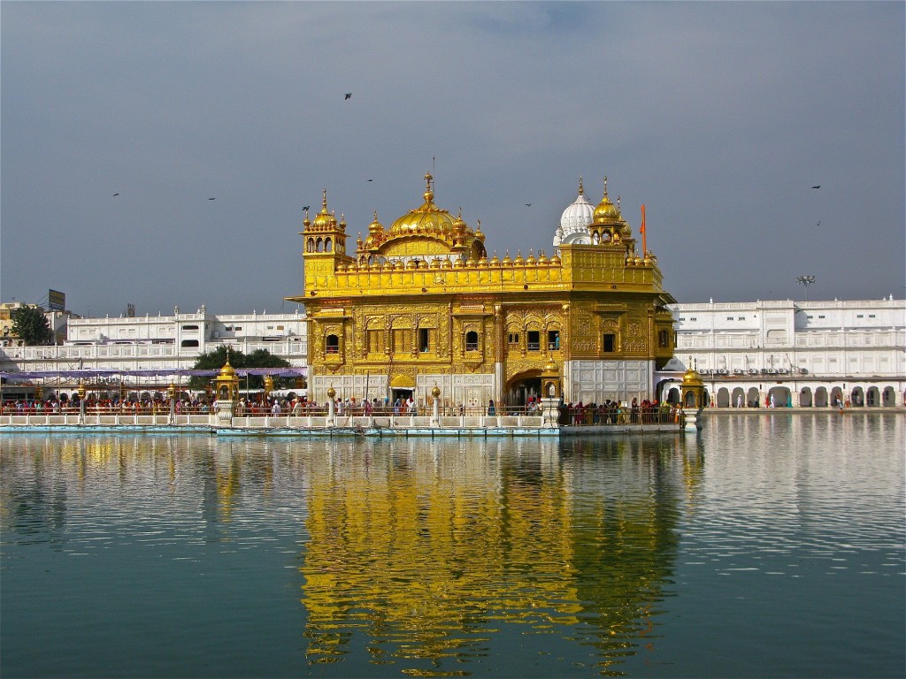 Description: A large building with a yellow dome on top of it's side in a lake with a few people around it.