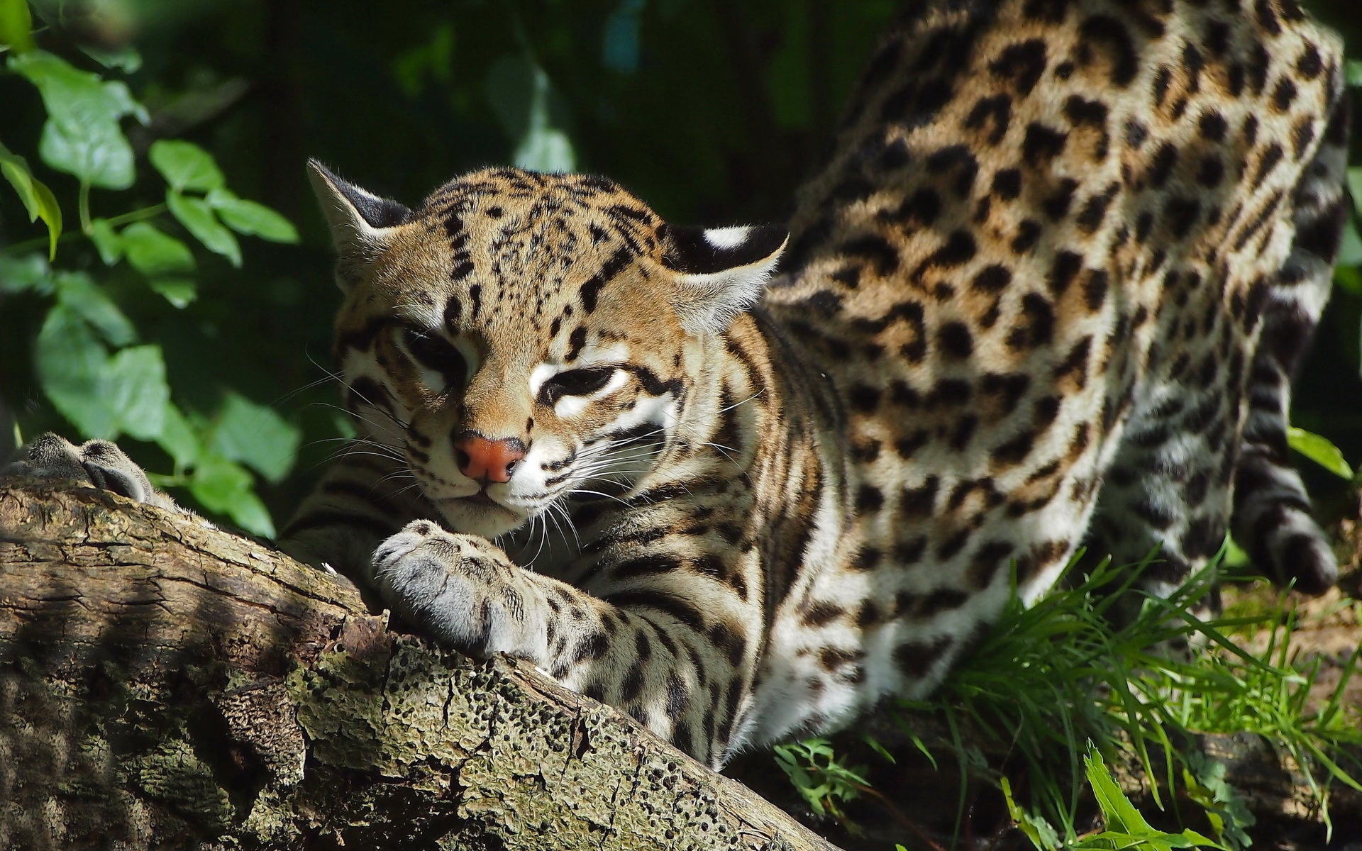 Description: A large cat walking on a tree branch in the woods with green leaves behind it and a large tree branch in the foreground.