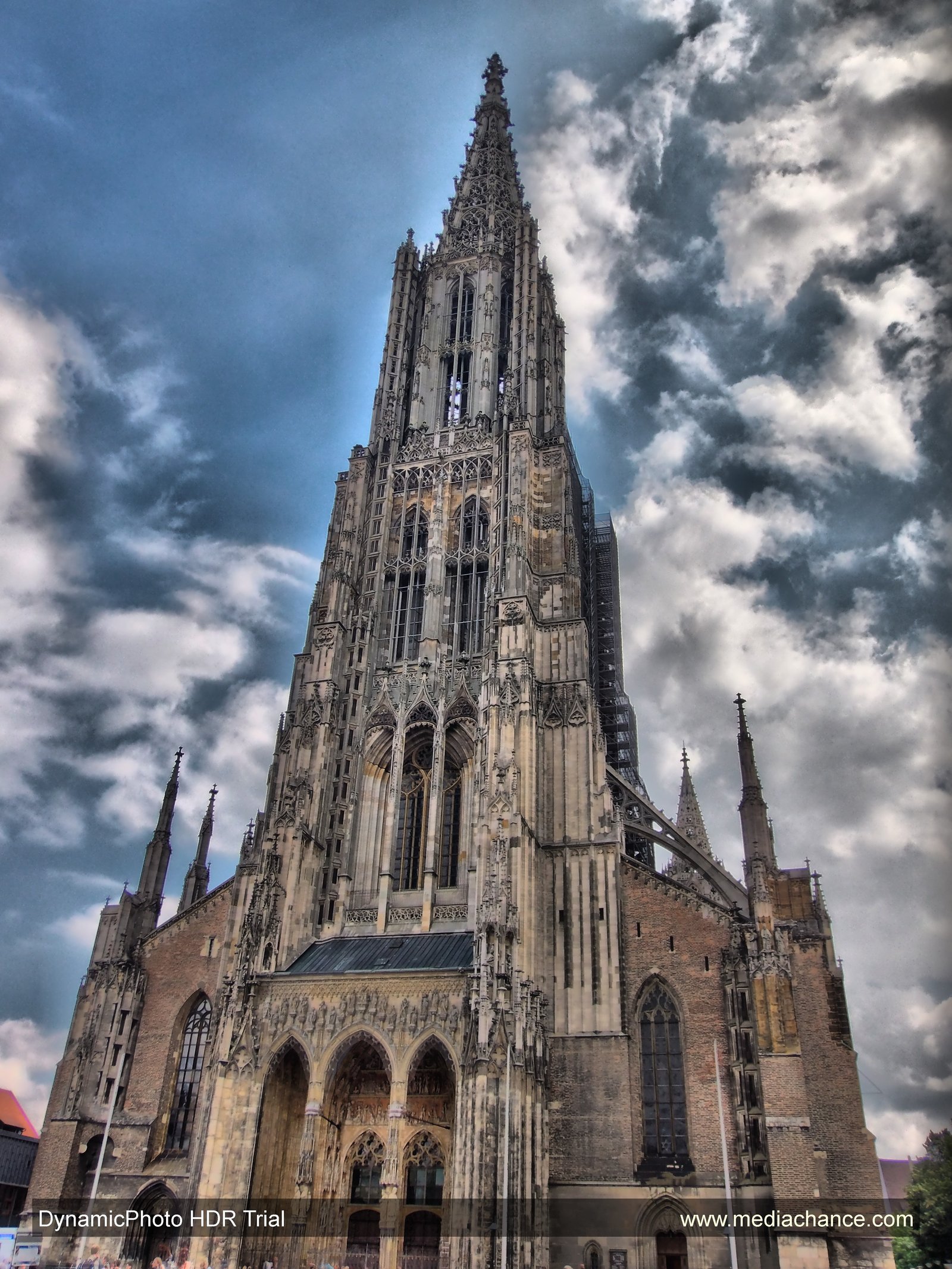 Description: A large cathedral with a clock tower on top of it's side under a cloudy sky with clouds.