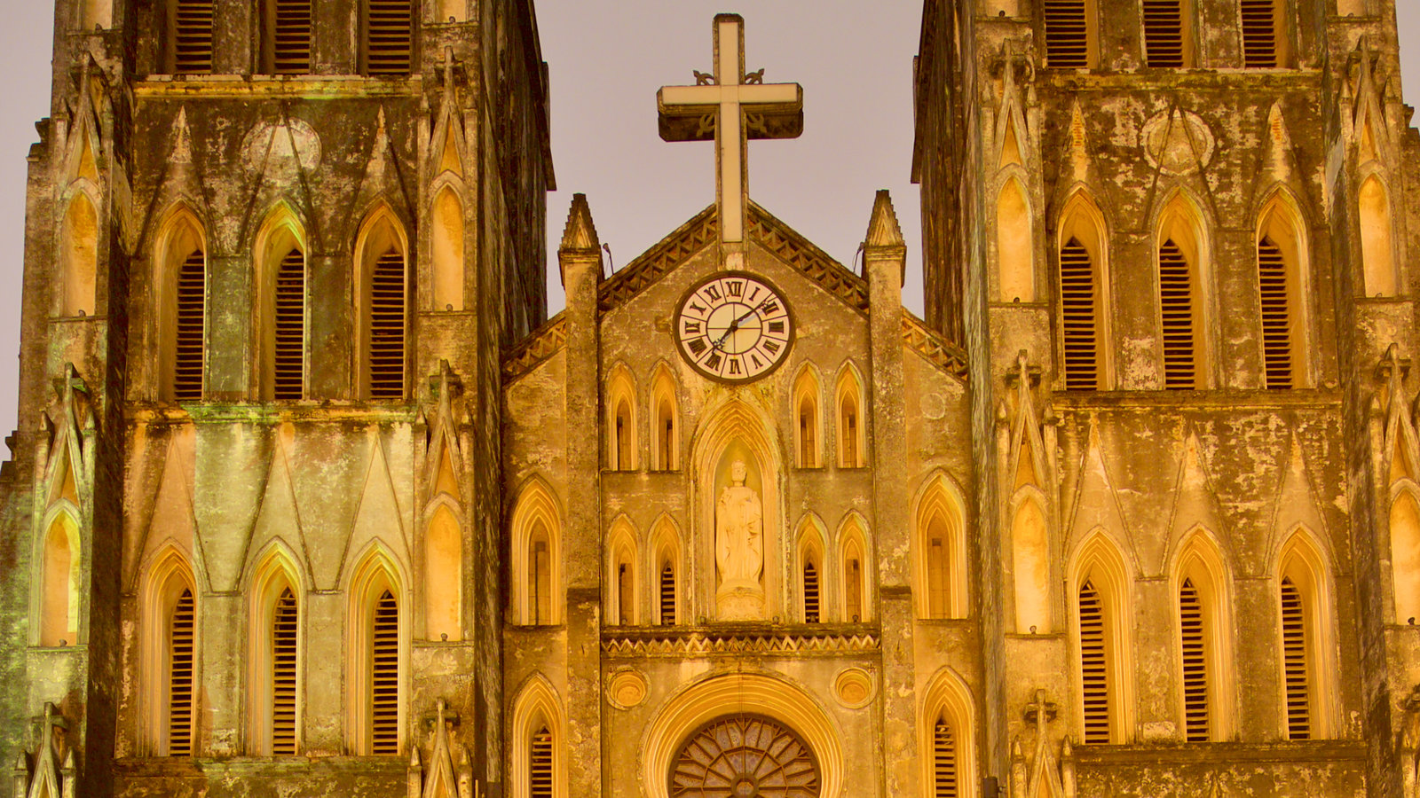 Description: A large cathedral with a clock on the front of it's tower and a cross on the top.
