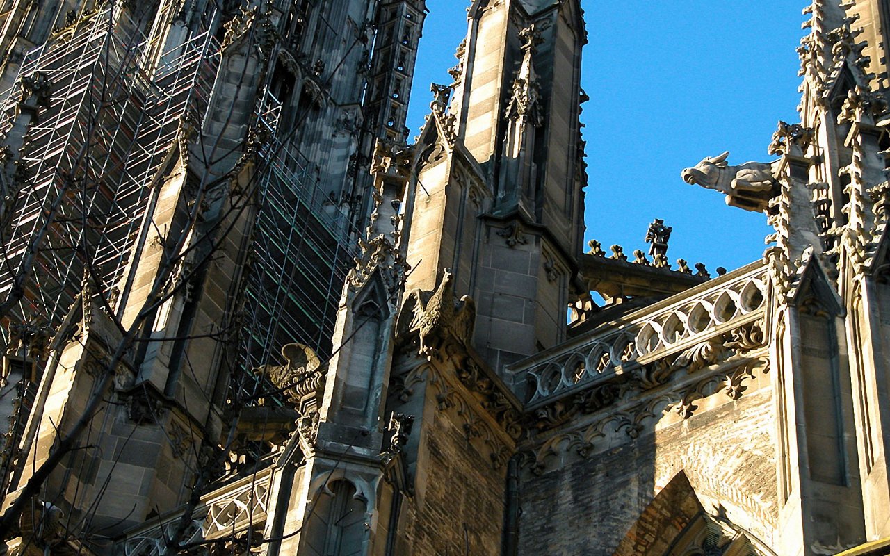 Description: A large cathedral with a clock on the front of it's tower and scaffoldings on the side.