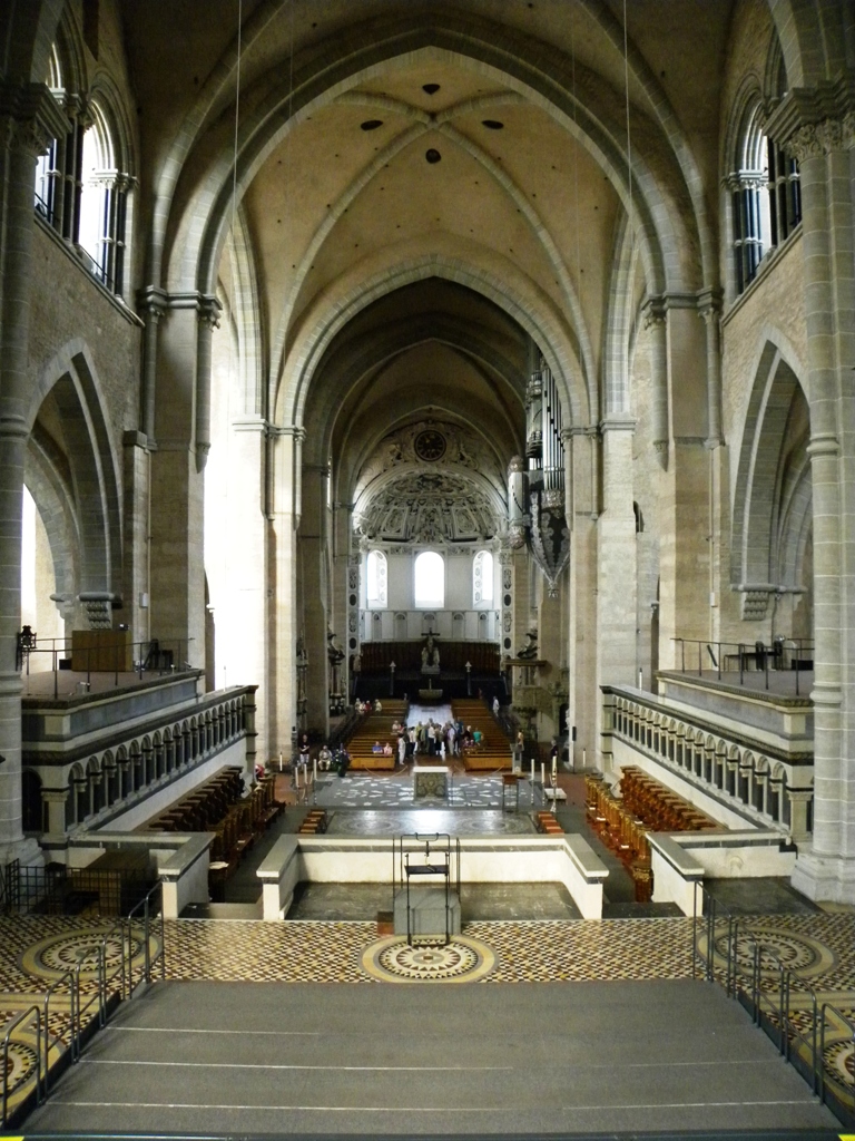 Description: A large cathedral with a pew and a pew bench in the center of the room and a pew bench in the middle of the room.