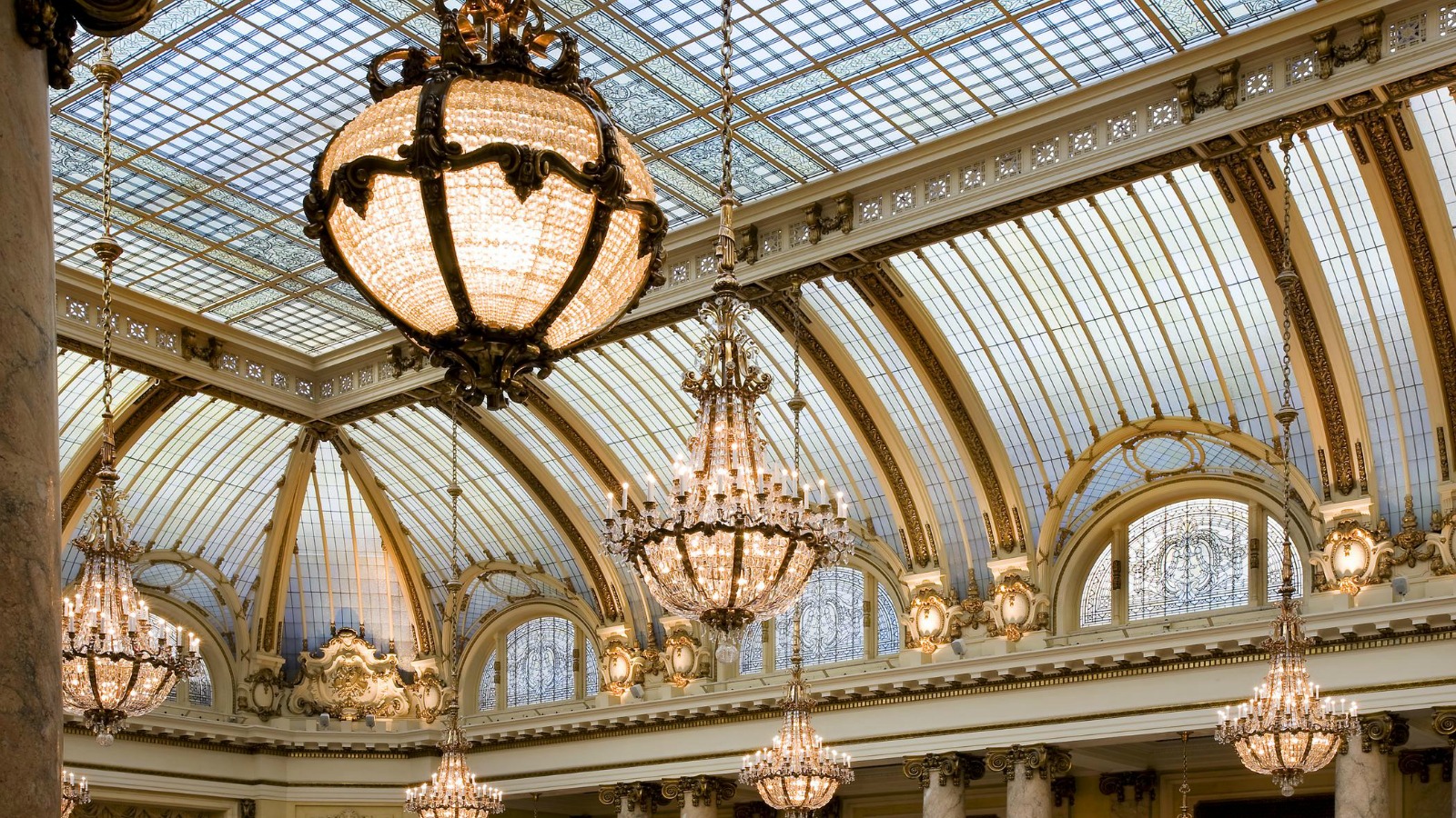 Description: A large chandelier hangs from the ceiling of a building with a glass ceiling and a chandelier hanging from the ceiling.