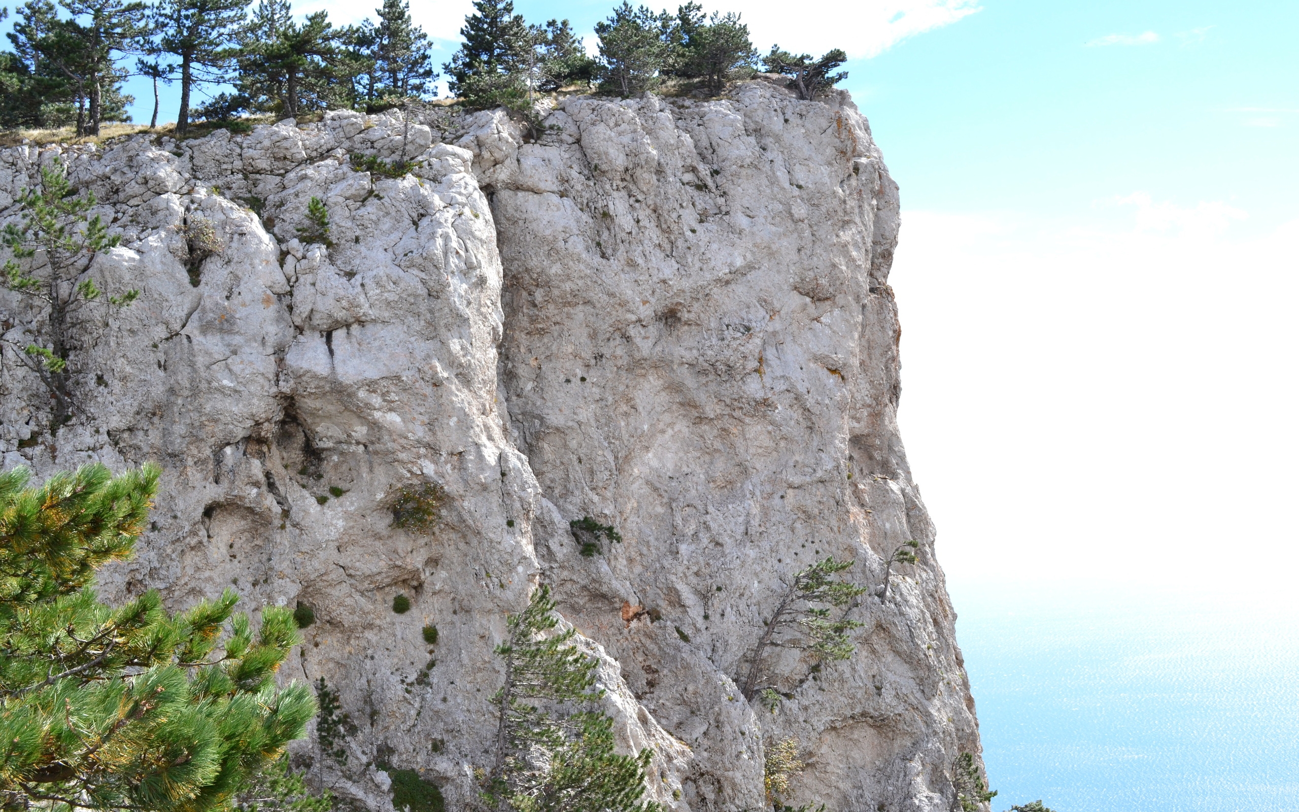 Description: A large cliff with a tree on top of it and a blue sky above it with clouds in the background.