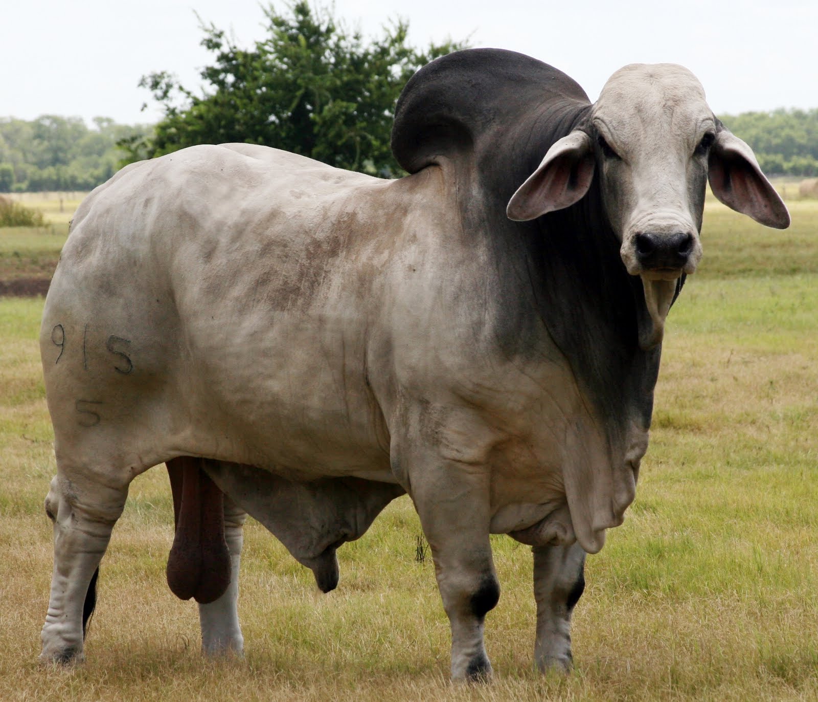 Description: A large cow standing in a field with trees in the background and grass in the foreground.