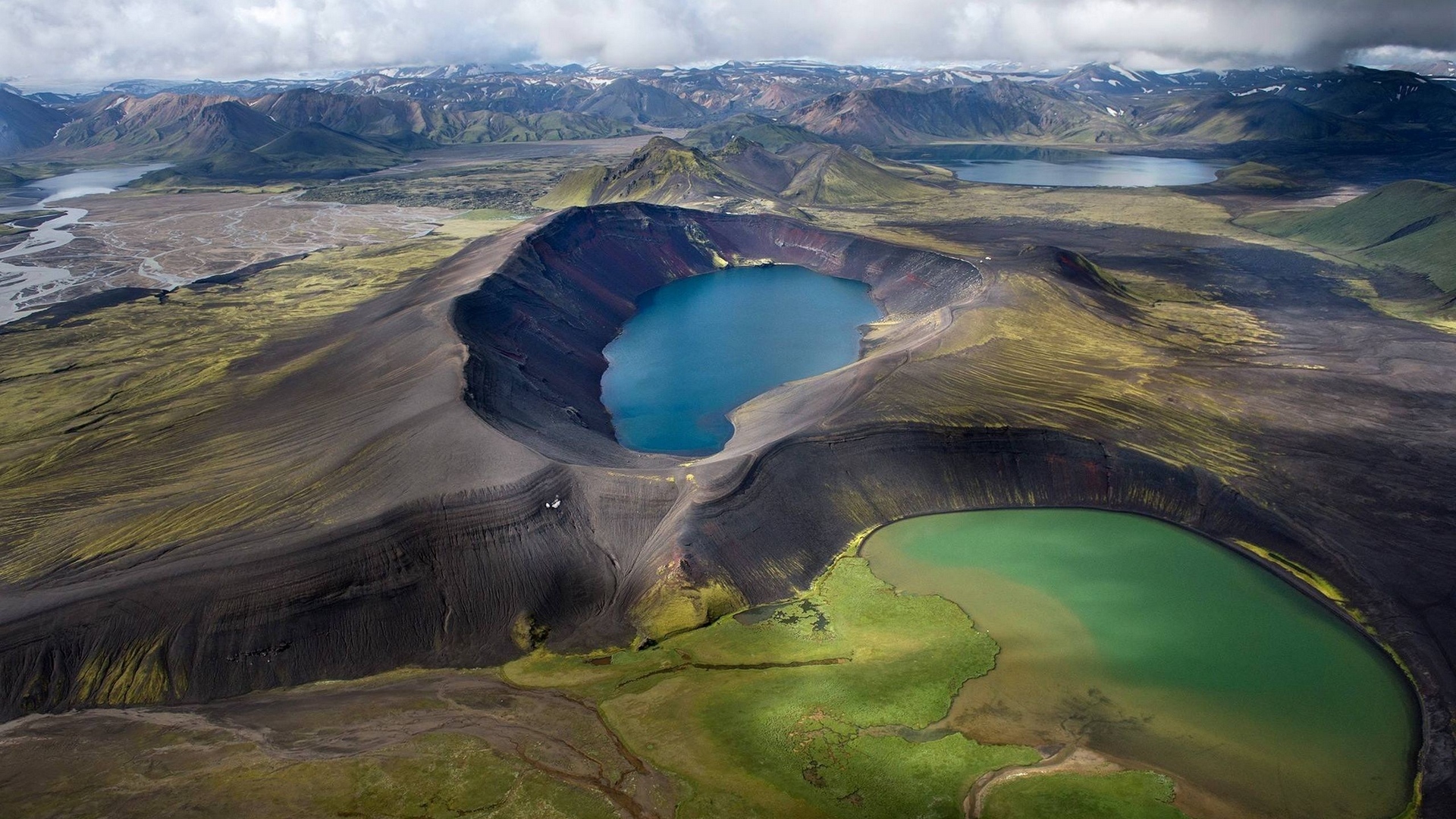 Description: A large crater with a lake in the middle of it and mountains in the background with clouds in the sky.