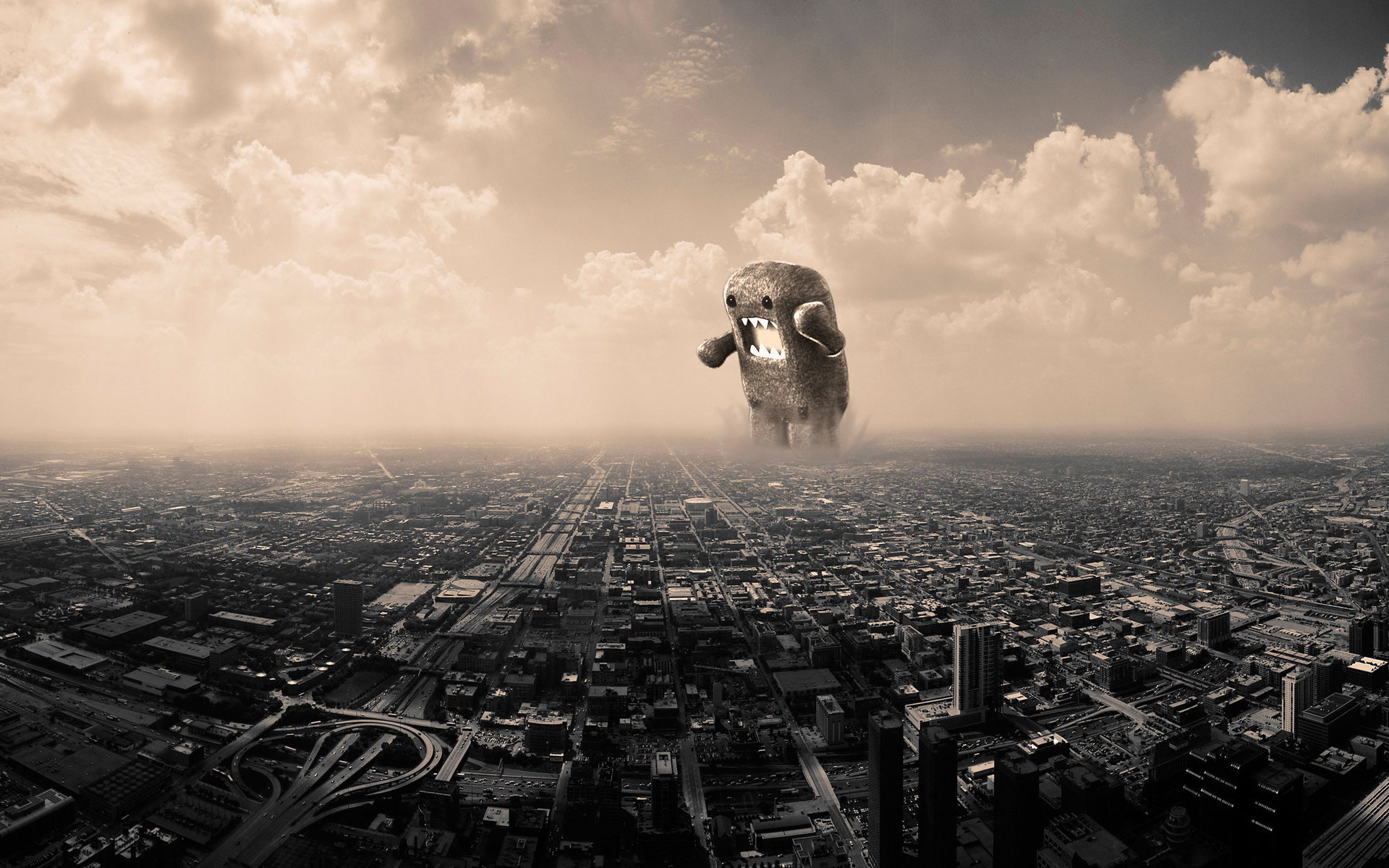 Description: A large elephant flying over a city under a cloudy sky with clouds in the background and a city below.