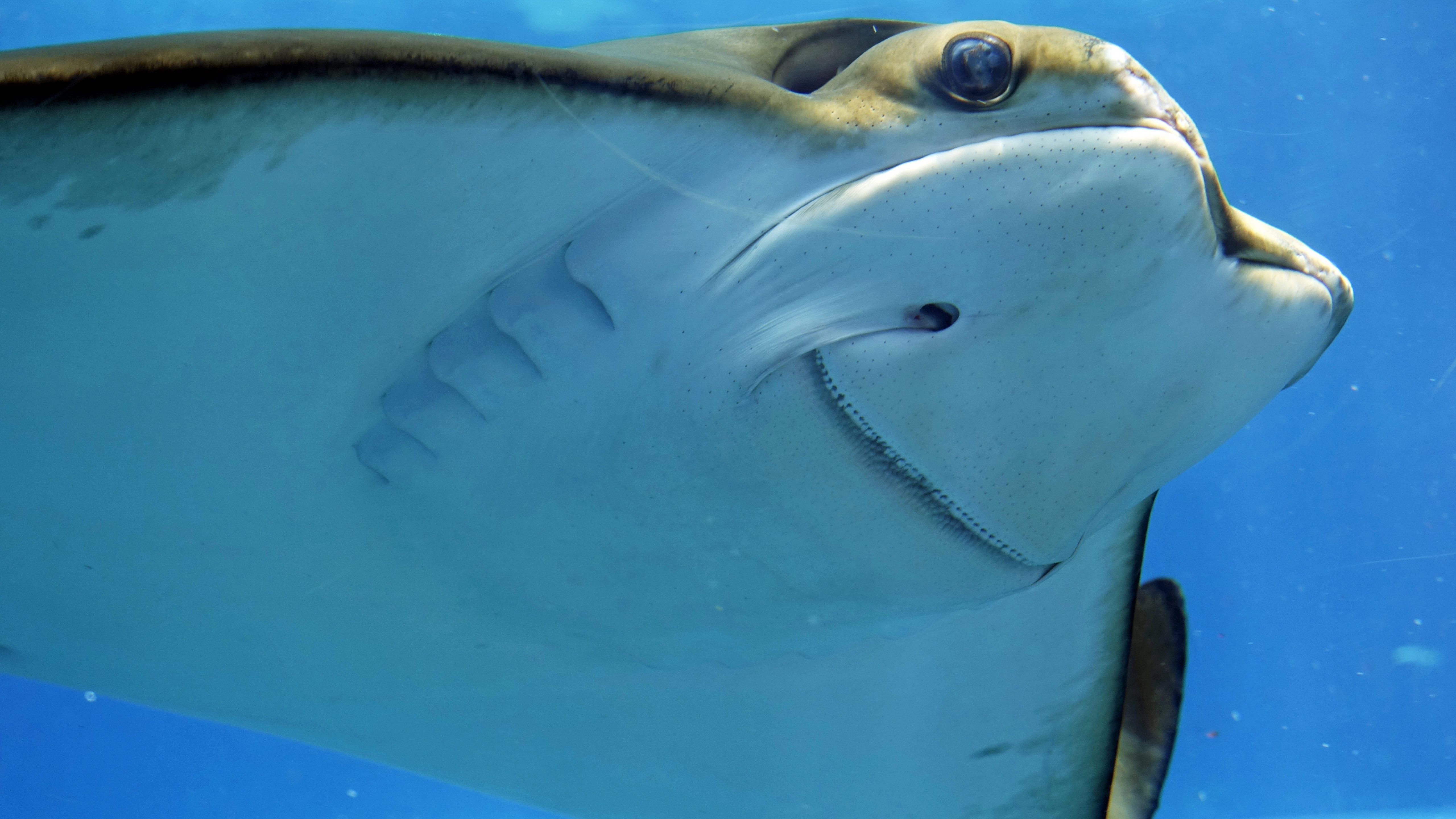 Description: A large fish with a very long nose and a smile on its face is swimming in the water with a blue background.