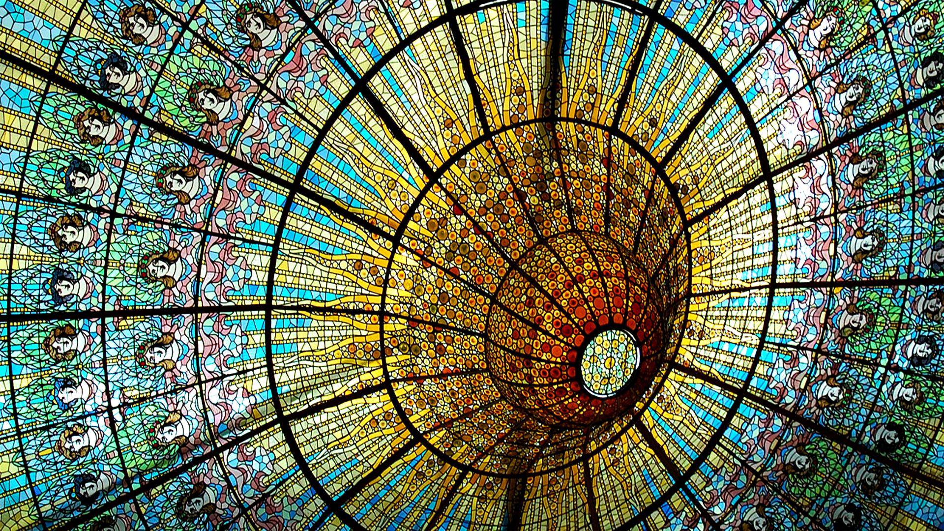 Description: A very large glass ceiling with a circular design on it's side and a skylight above it.