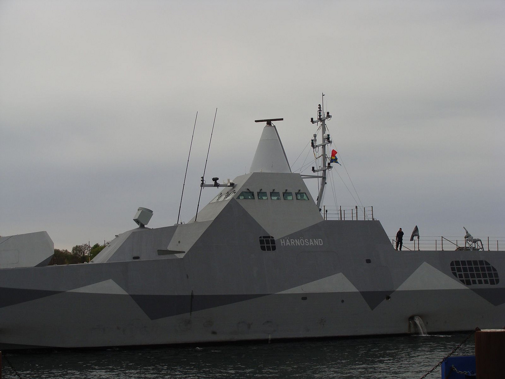 Description: A large gray boat sitting in the water next to a dock with people on it and a flag on top of it.