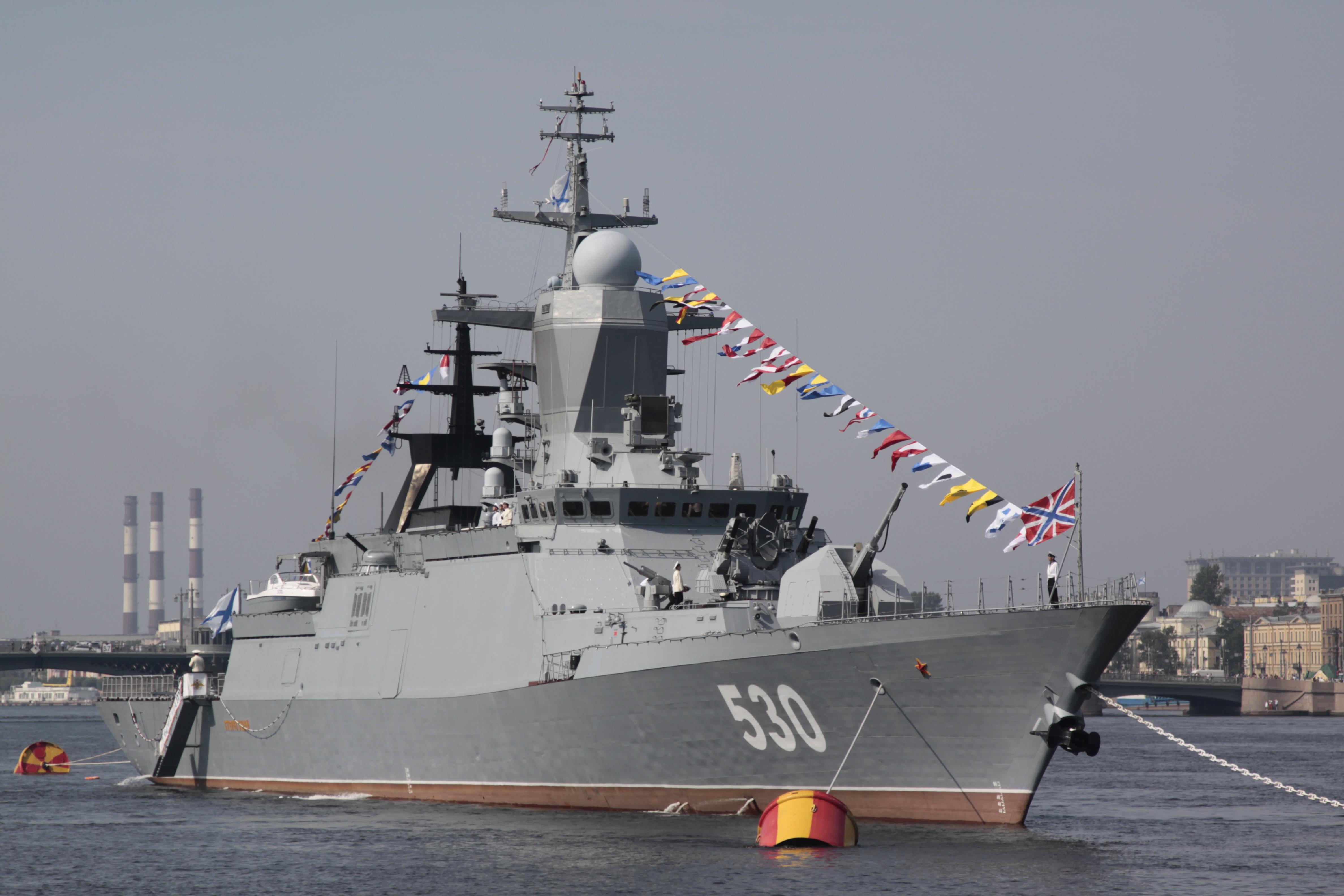 Description: A large gray boat with flags on it in the water near a dock and buildings in the background with a sky background.