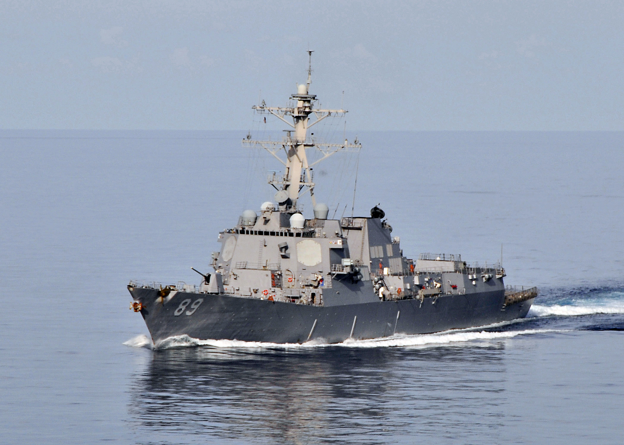 Description: A large gray boat in the middle of the ocean with a smaller boat in the background in the water.