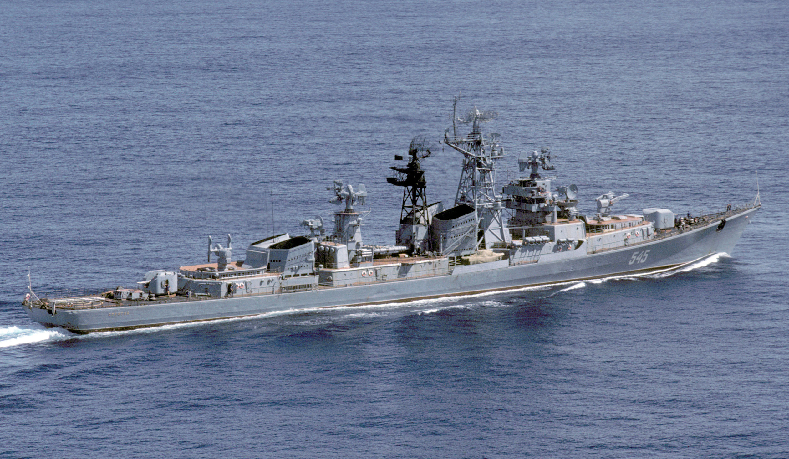 Description: A large gray boat in the middle of the ocean with a lot of smoke coming out of it's chimney.