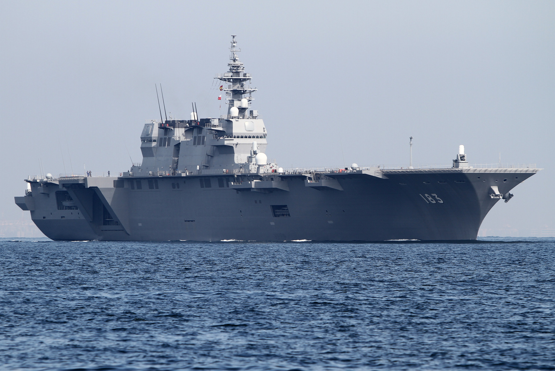 Description: A large gray ship in the middle of the ocean with a sky background and a few clouds in the sky.