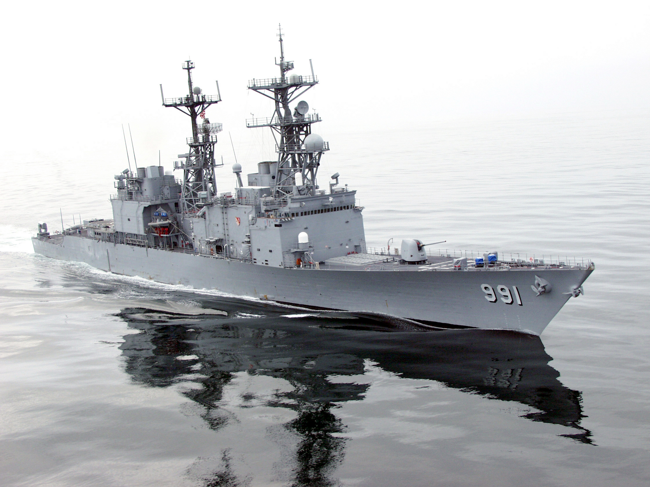 Description: A large gray ship in the water with a sky background and a few clouds in the sky above it.