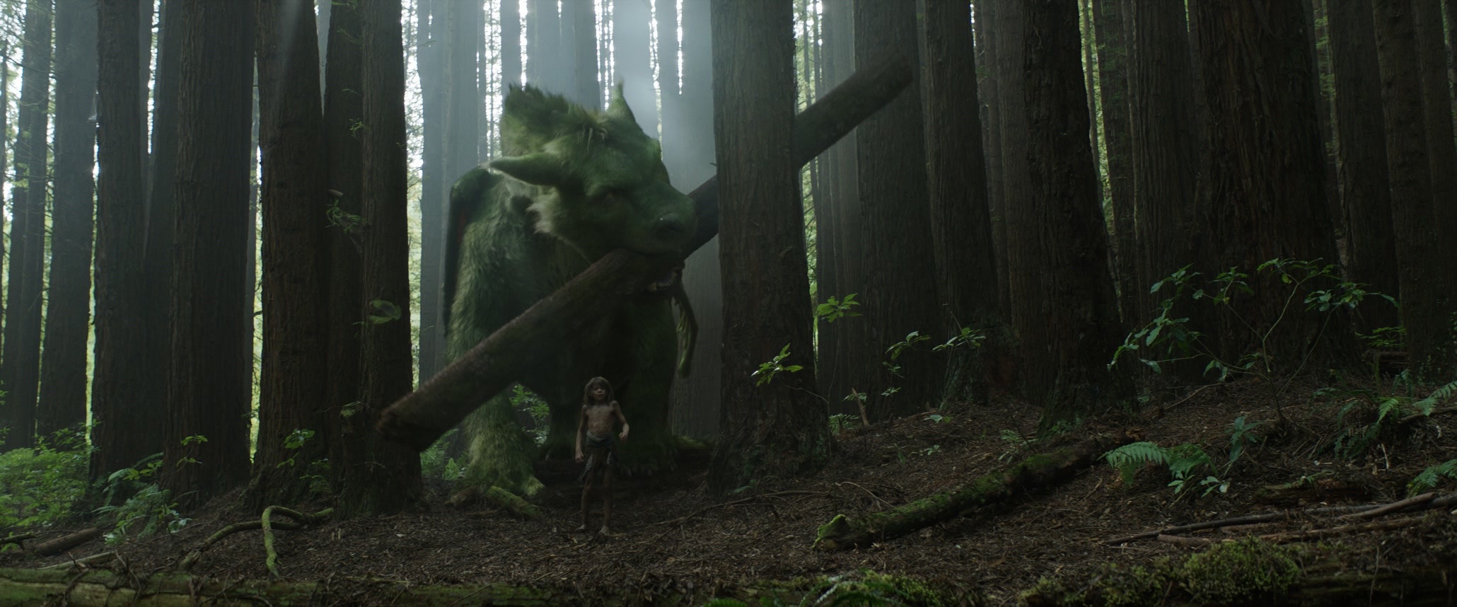 Description: A large green animal standing in a forest next to a tree branch with a person standing next to it.