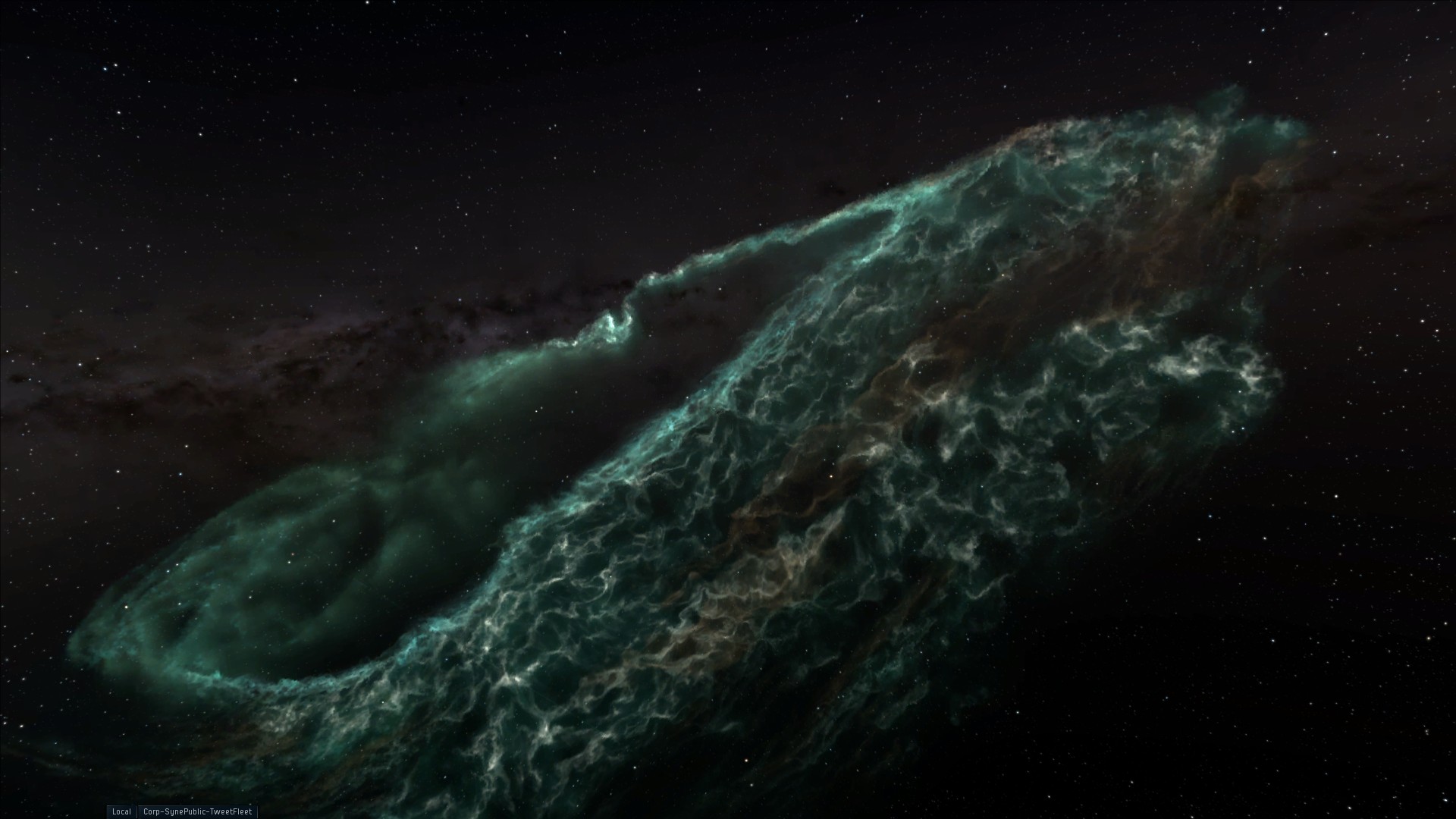 Description: A very large green object in the sky with stars around it and a black background with a green swirl.