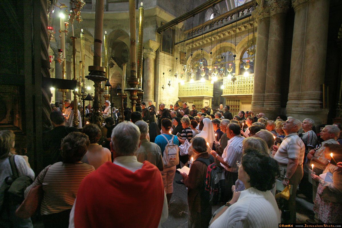 Description: A large group of people standing in a church with candles in their hands and candles in their hands in front of them.