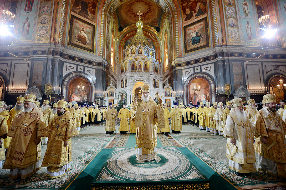 Description: A large group of people in yellow robes in a church with a priest in the center of the room.