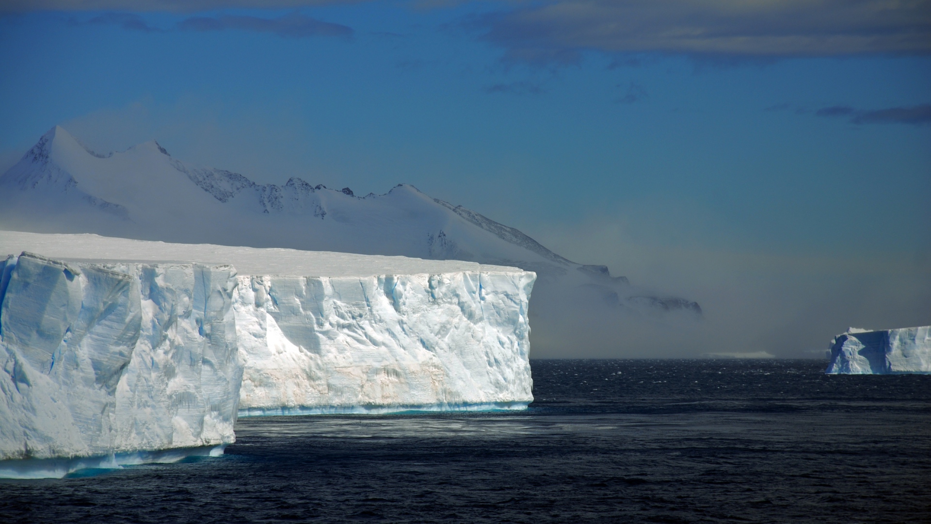 Description: A large iceberg floating in the ocean near a mountain range in the distance with a cloud filled sky.