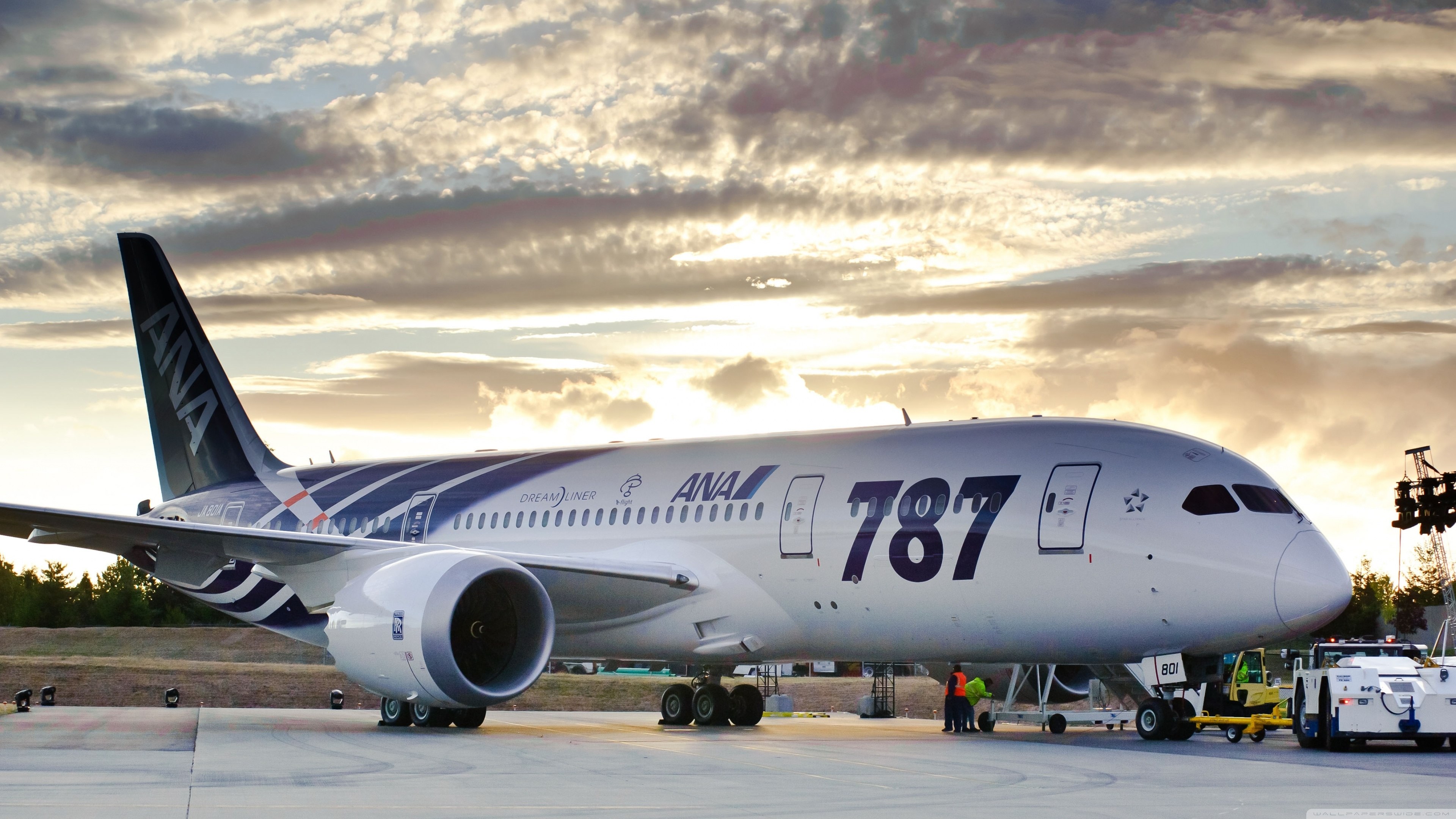 Description: A large jetliner sitting on top of an airport tarmac under a cloudy sky with a few people.