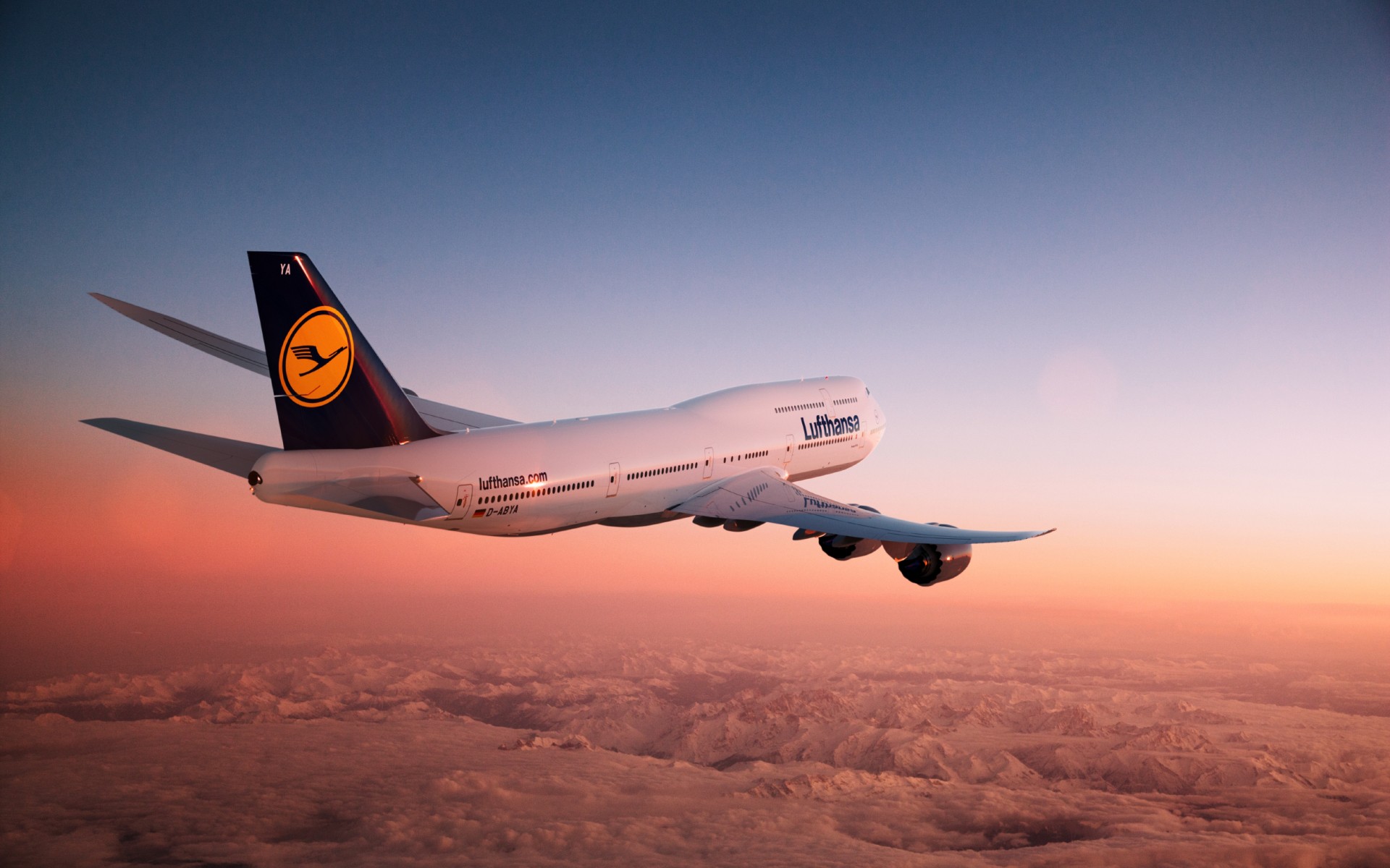 Description: A large jetliner flying through a blue sky above clouds and land below it with a sun setting behind it.