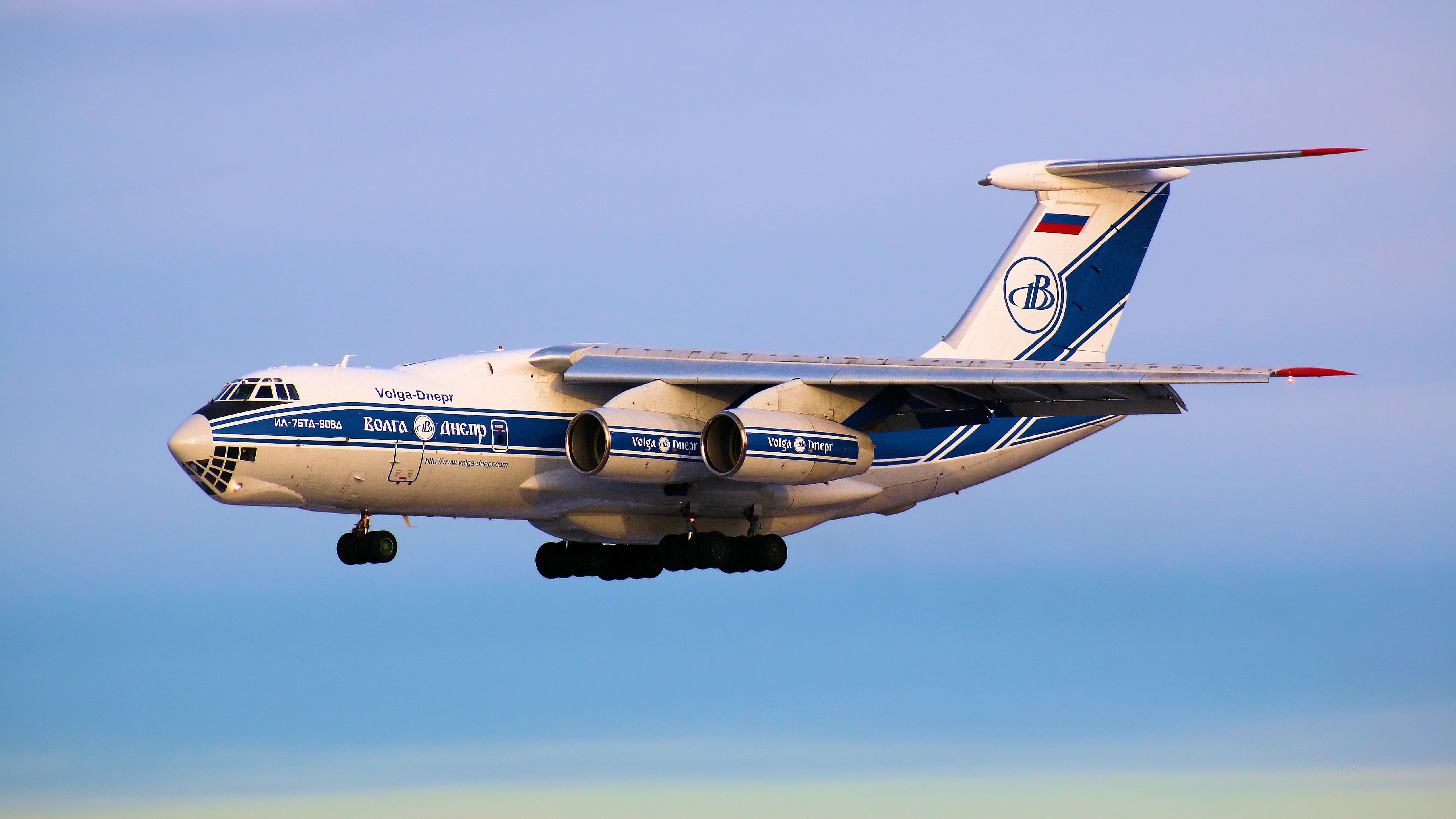 Description: A large jetliner flying through a blue sky with a landing gear down and a nose on the nose.