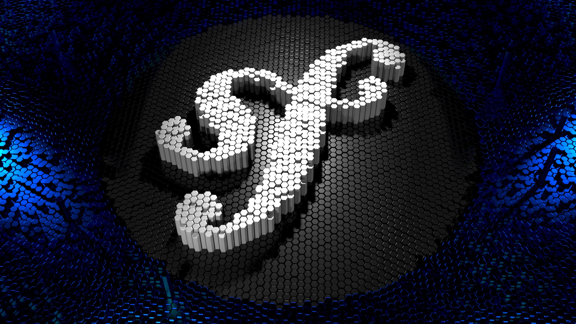 Description: A very large letter made out of small objects on a black surface with blue and white patterns around it.