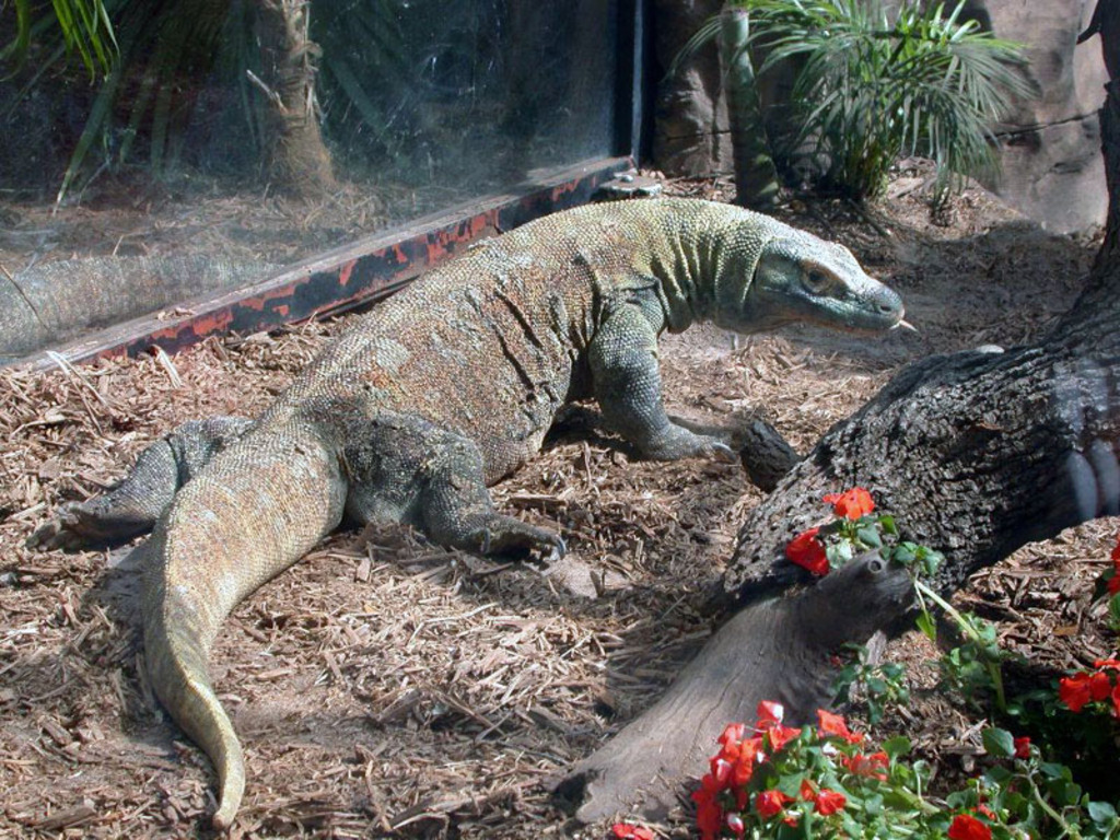 Description: A large lizard is sitting in the dirt near a tree and flowers in a garden area with a window.