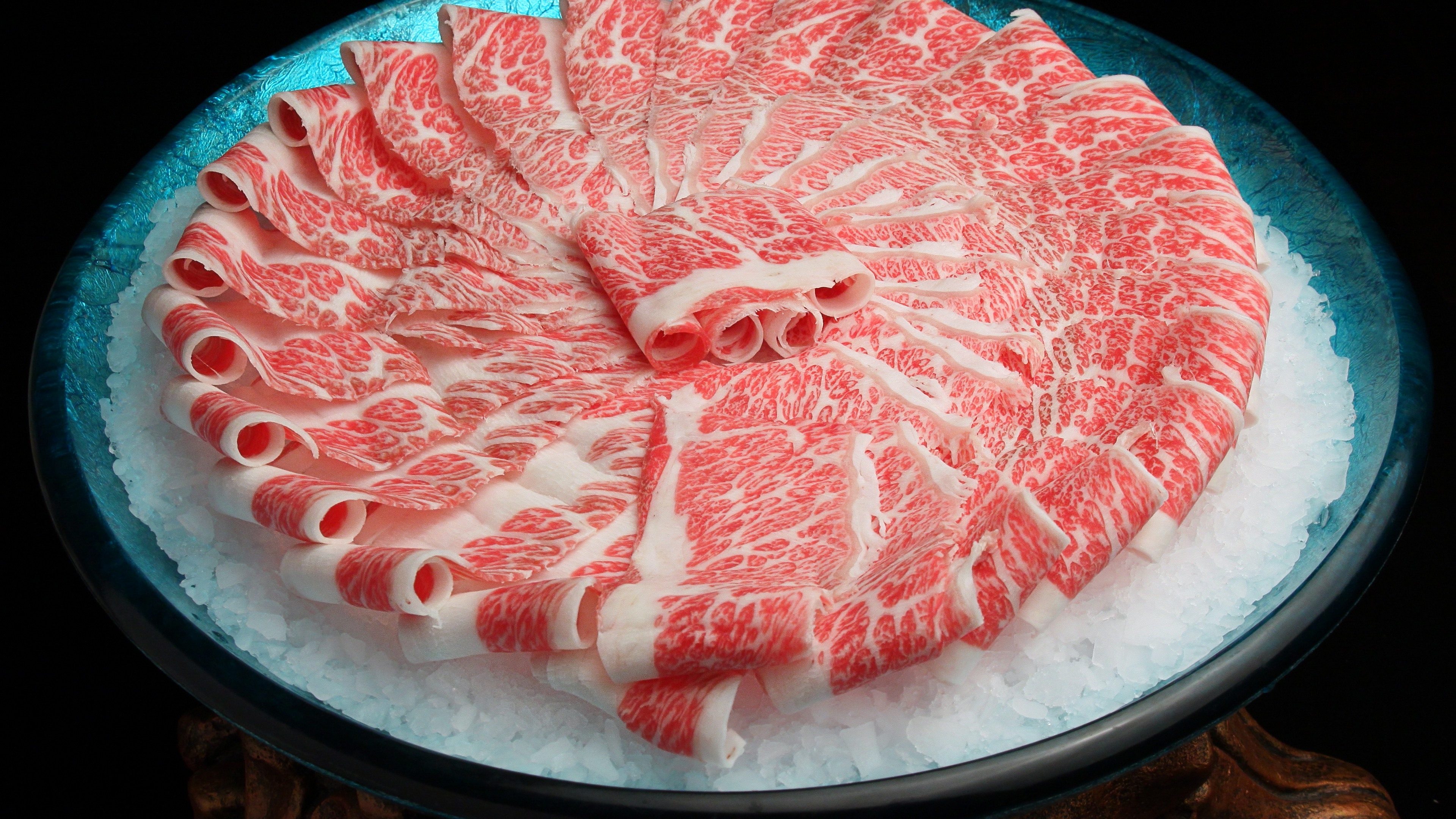 Description: A large piece of meat on a plate on a table with ice and a carving of a horse head.