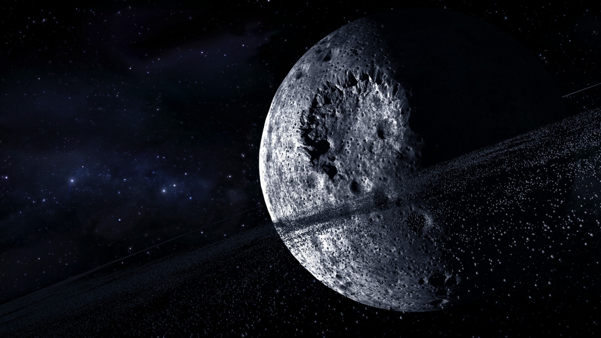 Description: A large moon in the middle of a dark sky with stars around it and a distant star in the distance.