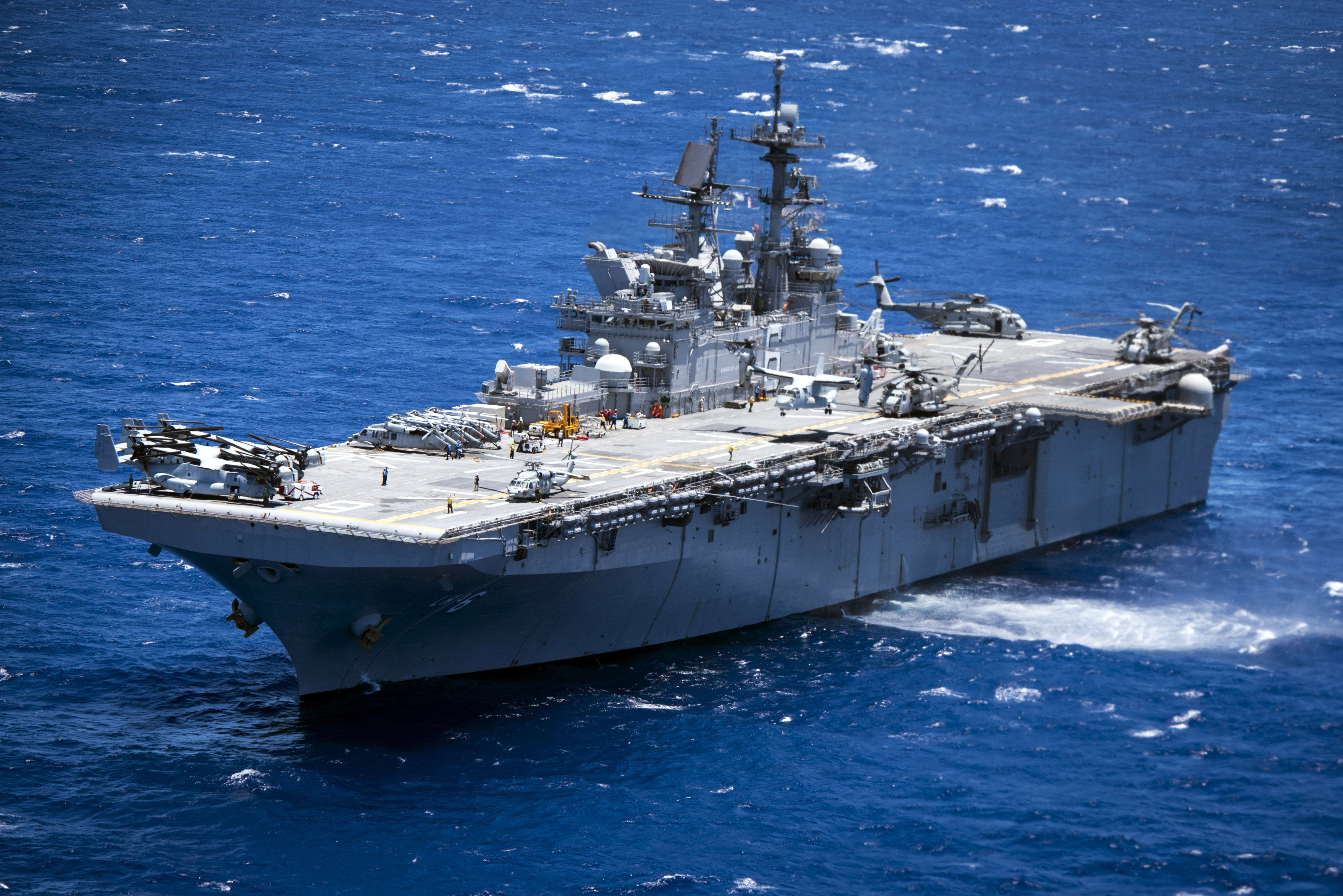 Description: A large navy ship in the middle of the ocean with a lot of guns on it's stern.