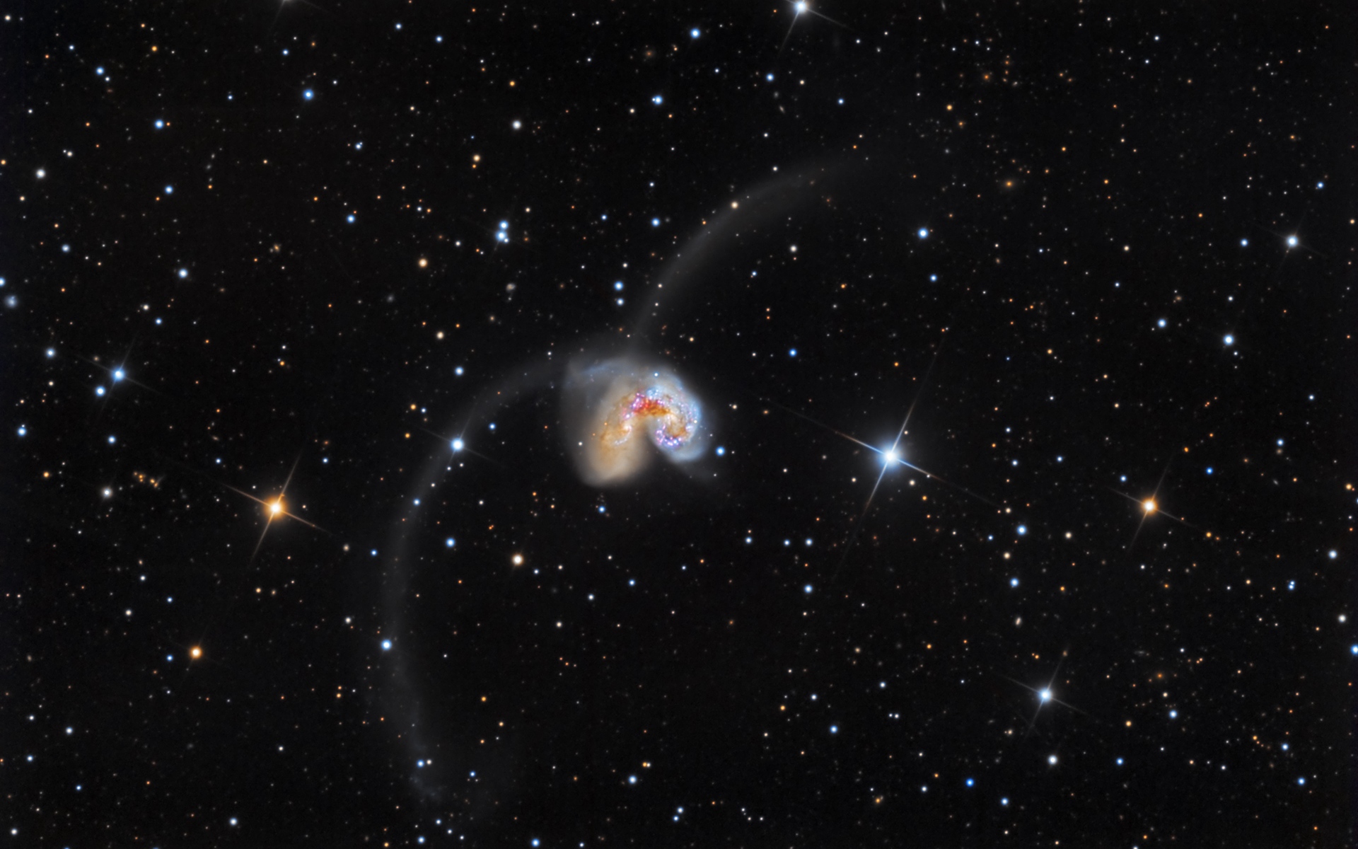 Description: A very large object in the middle of a dark sky with stars around it and a bright red object in the middle of the sky.