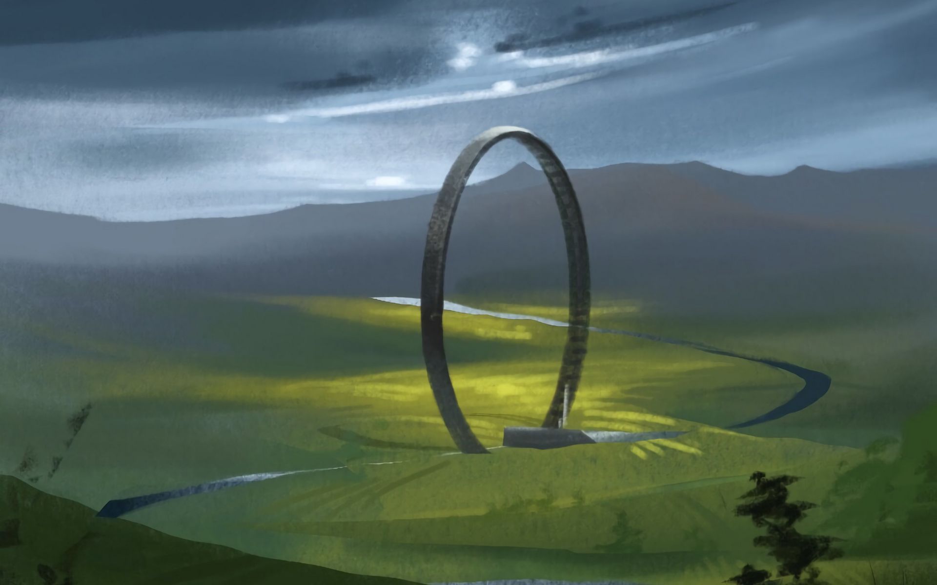 Description: A painting of a large object in a field with a sky background and a river running through it.