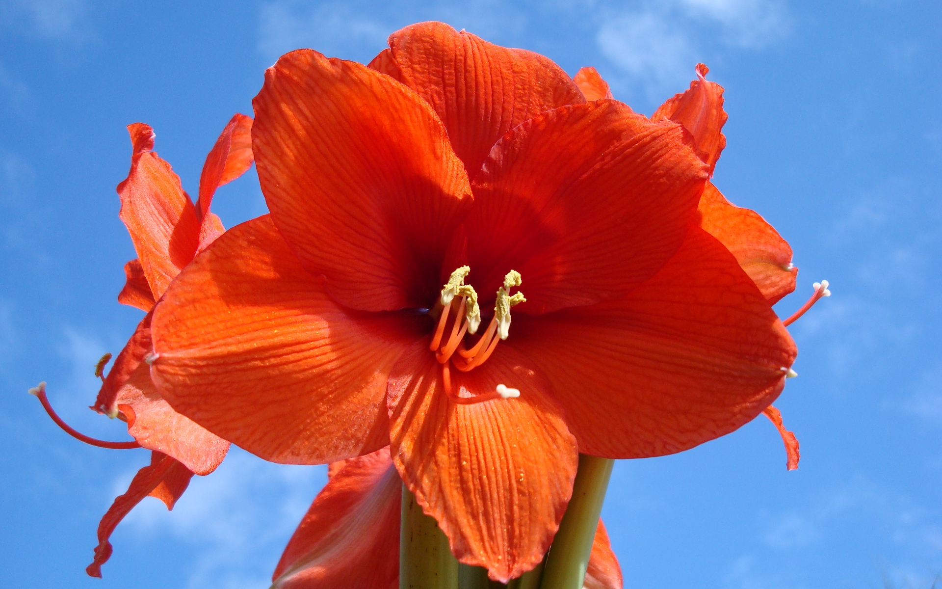 Description: A large orange flower with a blue sky in the background with clouds in the background and a few small white dots on the center of the flower.